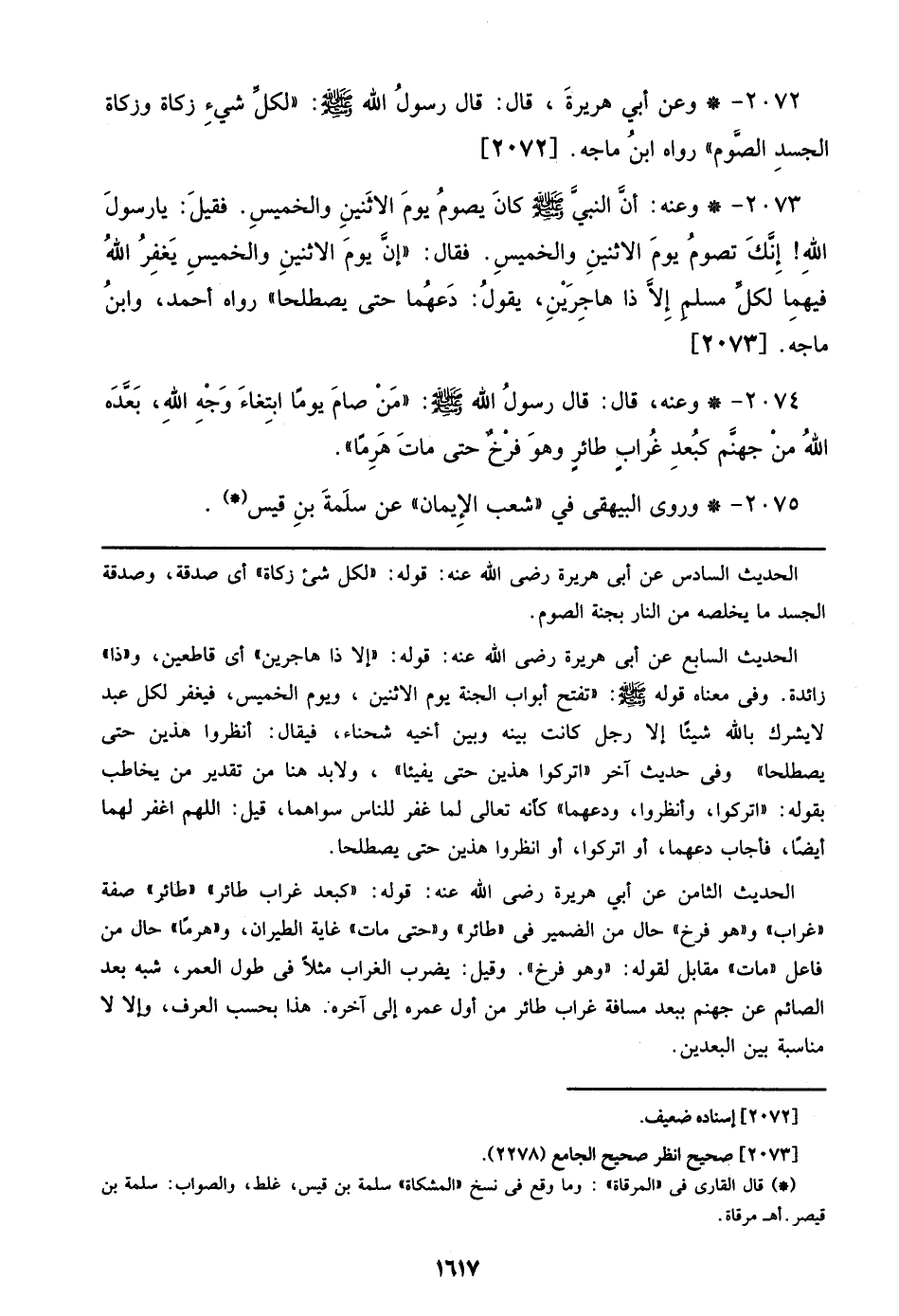 2072 - وعن أبي هريرةَ، قال: قال رسول الله صلى الله عليه وسلم: ((لكلَّ شيءِ زكاة وزكاة الجسد الصوم)) رواه ابن ماجه. [2072]