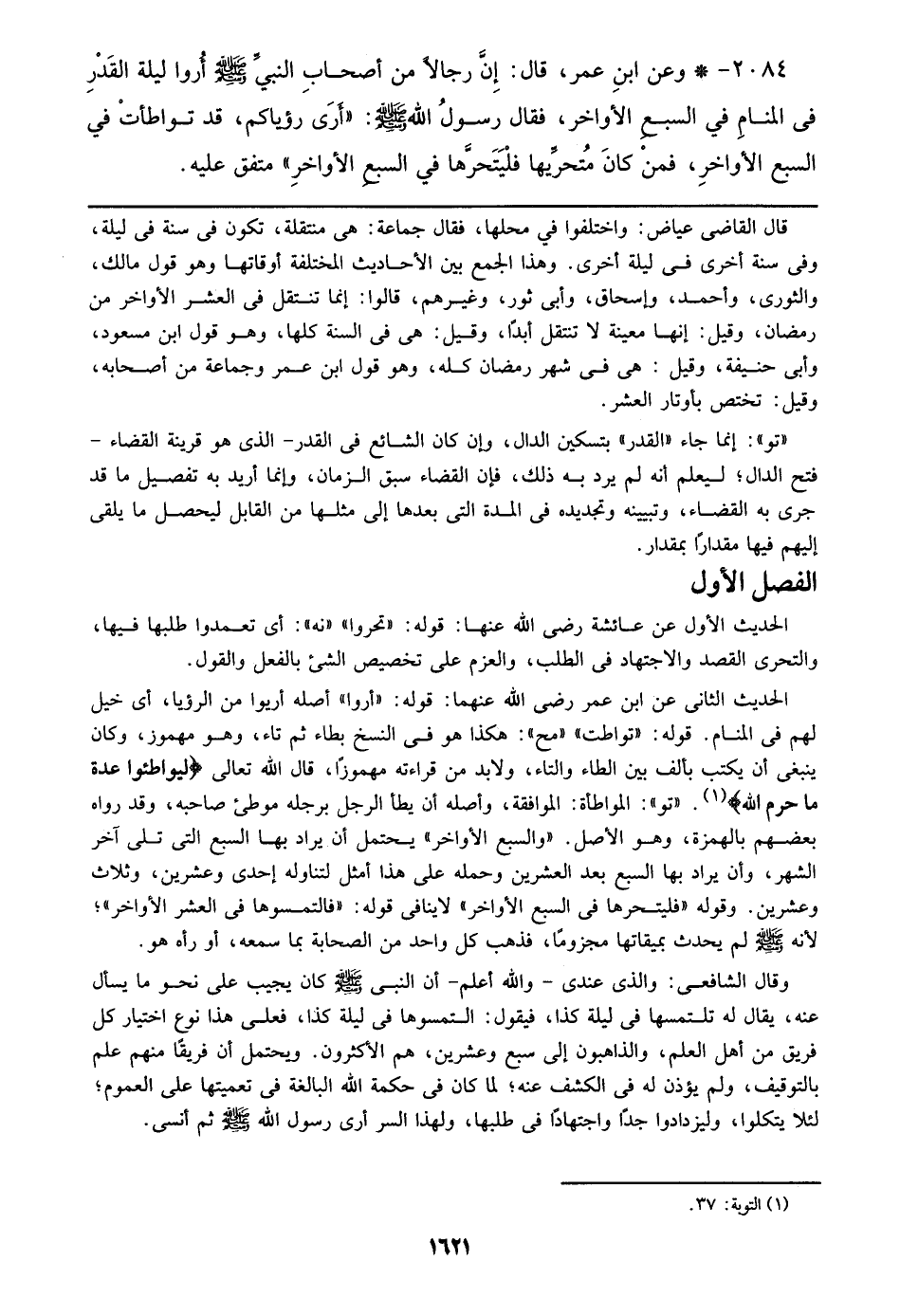 2084 - وعن ابنِ عمر، قال: إِنَّ رجالاً من أصحاب النبيِّ صلى الله عليه وسلم أًروا ليلة القَدْرِ في المنامِ في السبع الأواخر، فقال رسولُ الله صلى الله عليه وسلم: ((أرَى رؤياكم، قد تواطأت في السبع الأواخرِ، فمن كان مُتحرِّيها فلْيَتَحرَّها في السبع الأواخر)) متفق عليه.