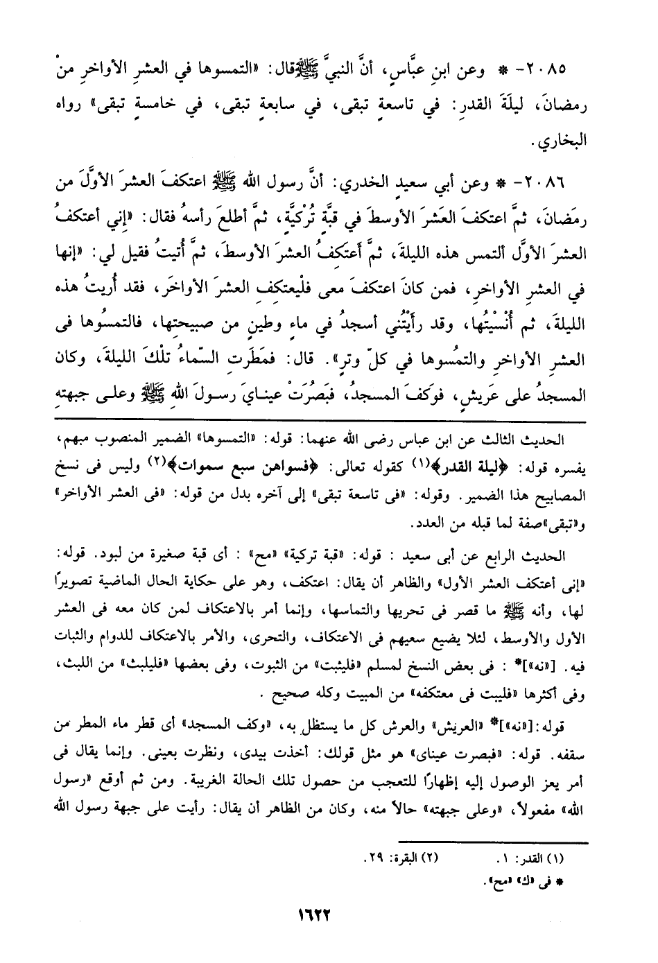 الحديث الرابع عن أبي سعيد: قوله: ((قبة تركية)) ((مح)): أي قبة صغيرة من لبود. قوله: ((إنى أعتكف العشر الأول)) والظاهر أن يقال: اعتكف، وهو علي حكاية الحال الماضية تصويرًا لها، وأنه صلى الله عليه وسلم ما قصر في تحريها والتماسها، وإنما أمر بالاعتكاف لمن كان معه في العشر الأول والأوسط، لئلا يضيع سعيهم في الاعتكاف، والتحرى، والأمر بالاعتكاف للدوام والثبات فيه. [((نه))]: في بعض النسخ لمسلم ((فليثبت)) من الثبوت، وفي بعضها ((فليلبث)) من اللبث، وفي أكثرها ((فليبت في معتكفه)) من المبيت وكله صحيح.