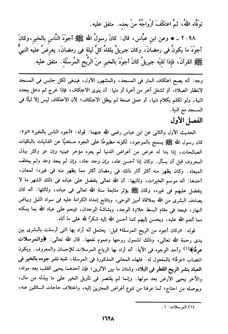 الحديث الأول والثانى عن ابن عباس رضي الله عنهما: قوله: ((أجود الناس بالخير)) ((تو)): كان رسول الله صلى الله عليه وسلم يسمح بالموجود، لكونه مطبوعًا علي الجود مستغنيًا عن الفإنيات بالباقيات الصالحات، إذا بدا له عرض من أعراض الدنيا لم يعره مؤخر عينيه وإن عز وكثر ببذل المعروف قبل أن يسأل. وكان إذا أحسن عاد، وإن وجد جاد، وإن لم يجد وعد ولم يخلف الميعاد. وكان يظهر منه أكثر آثار ذلك في رمضان أكثر مما يظهر منه في غيره؛ لمعان، أحدها: أنه موسم الخيرات، وثإنيها: أن الله تعالي يتفضل علي عباده في ذلك الشهر ما لا يتفضل عليهم في غيره، وكان صلى الله عليه وسلم يؤثر متابعة سنة الله تعالي في عباده، وثالثها: أنه كان يصادف البشرى من الله بملاقاة أمين الوحى، وبتتابع إمداد الكرامة عليه في سواد الليل وبياض النهار، فيجد في مقام البسط حلاوة الوجد، وبشاشة الوجدان، فينعم علي عباد الله بما يمكنه مما أنعم الله عليه، ويحسن إليهم كما أحسن الله إليه شكرًا لله علي ما آتاه.