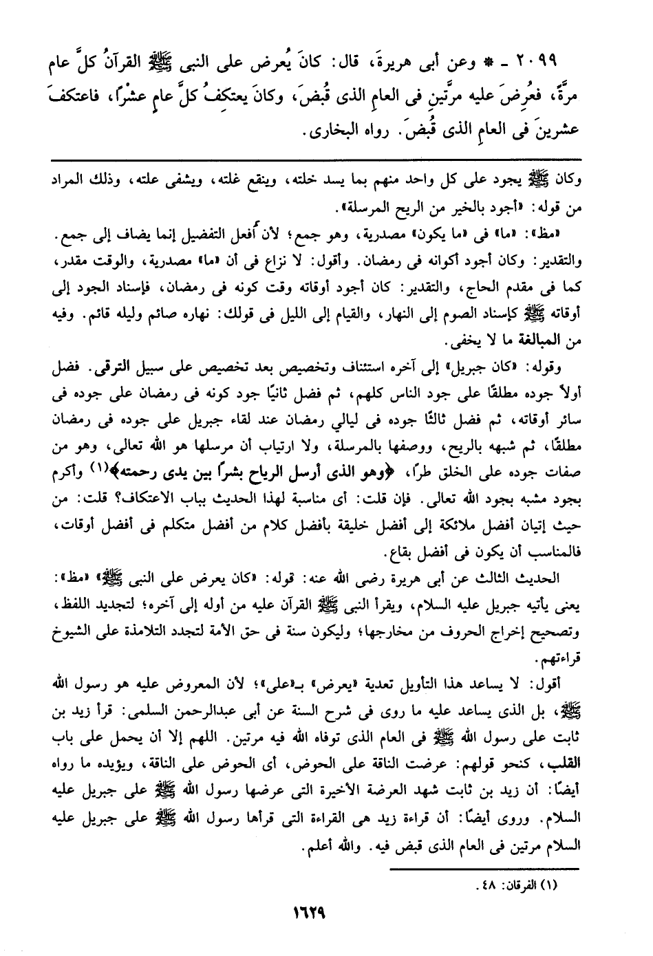 أقول: لا يساعد هذا التأويل تعدية ((يعرض)) بـ ((علي))؛ لأن المعروض عليه هو رسول الله صلى الله عليه وسلم، بل الذي يساعد عليه ما روى في شرح الله عن أبي عبد الرحمن السلمى: قرأ زيد بن ثابت علي رسول الله صلى الله عليه وسلم في العام الذي توفاه الله فيه مرتين. اللهم إلا أن يحمل علي باب القلب، كنحو قولهم: عرضت الناقة علي الحوض، أي الحوض علي الناقة، ويؤيده ما وواه أيضًا: أن زيد بن تابت شهد العرضة الأخيرة التي عرضها رسول الله صلى الله عليه وسلم علي جبريل عليه السلام. وروى أيضًا: أن قراءة زيد هي القراءة التي قرأها رسول الله صلى الله عليه وسلم علي جبريل عليه السلام مرتين في العام الذي قبض فيه. والله أعلم.
