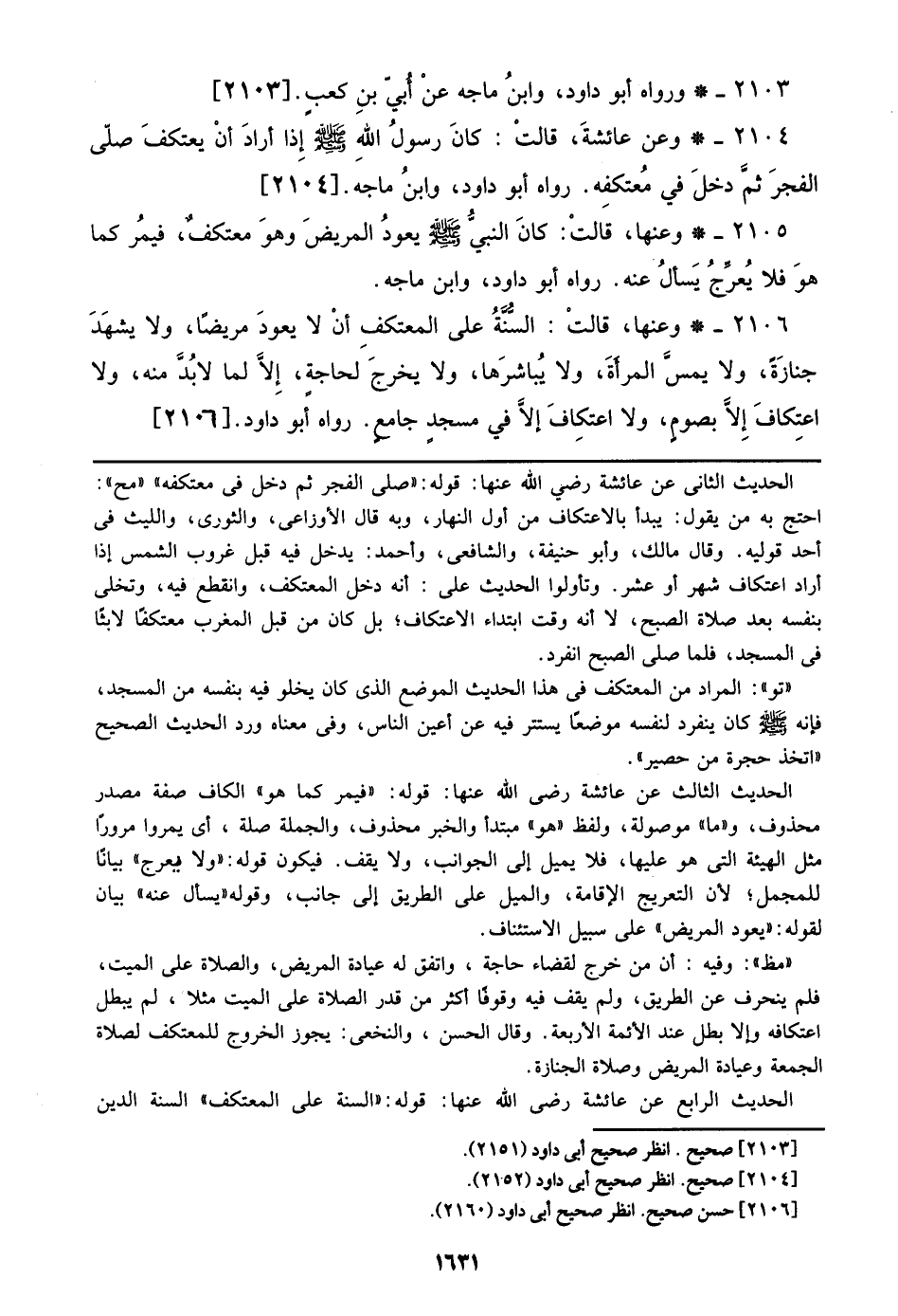 2105 - وعنها، قالتْ: كانَ النبيُّ صلى الله عليه وسلم يعودُ المريضَ وهوَ معتكفٌ، فيمُر كما هوَ فلا يُعرِّجُ يسألُ عنه. رواه أبو داود، وابن ماجه.