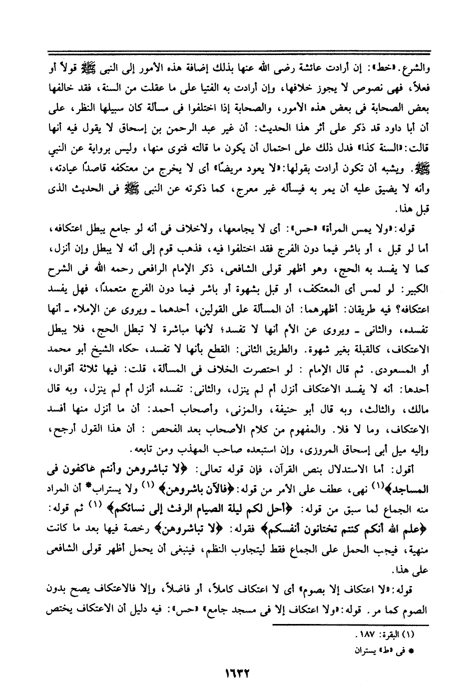 أقول: أما الاستدلال بنص القرآن، فإن قوله تعالي: {لا تباشروهن وأنتم عاكفون في المساجد} نهي، عطف علي الأمر من قوله: {فالآن باشروهن} ولا يستراب أن المراد منه الجماع لما سبق من قوله: {أحل لكم ليلة الصيام الرفث إلي نسائكم} ثم قوله: {علم الله أنكم كنتم تختانون أنفسكم} فقوله: {لا تباشروهن} رخصة فيها بعد ما كانت منهية، فيجب الحمل علي الجماع فقط ليتجاوب النظم، فينبغى أن يحمل أظهر قولي الشافعى علي هذا.