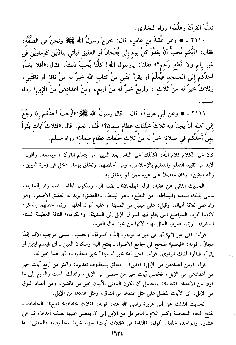 2110 - وعن عُقبةَ بن عامرٍ، قال: خرج رسول الله صلى الله عليه وسلم ونحنُ في الصُّفَّة، فقال: ((أيُّكم يُحبُّ أن يغدُوَ كلَّ يومٍ إلي بُطحانَ أو العقيق فيأتي بناقتين كوماوينِ في غير إثمٍ ولا قطعِ رحمٍ؟)) فقلنا: يا رسول الله! كلُّنا يُحب ذلك. فقال: ((أفلا يغدو أحدُكم إلي المسجدِ فيُعلِّم أو يقرأ آيتين من كتاب الله خسرٌ له من ناقةِ أو ناقتينِ، وثلاثٌ خسرٌ له من ثلاثٍ، وأربعٌ خيرٌ له من أربعٍ، ومن أعدادهنَّ من الإبل)) رواه مسلم.