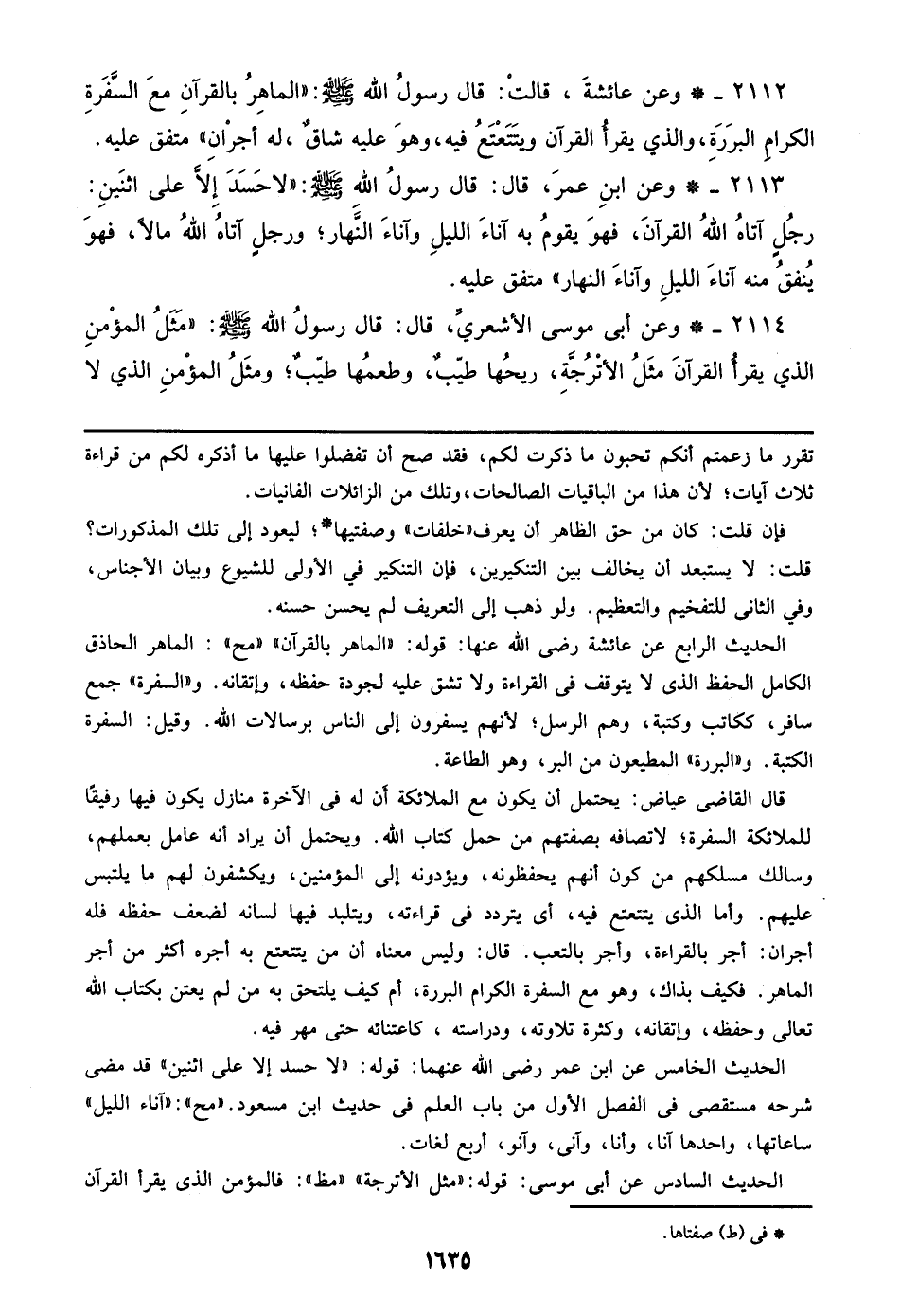 الحديث الرابع عن عائشة رضي الله عنها: قوله: ((الماهر بالقرآن)) ((مح)): الماهر الحاذق الكامل الحفظ الذي لا يتوقف في القراءة ولا تشق عليه لجودة حفظه، وإتقانه. و ((السفرة)) جمع سافر، ككاتب وكتبة، وهم الرسل؛ لأنهم يسفرون إلي الناس برسالات الله. وقيل: السفرة الكتبة. و ((البررة)) المطيعون من البر، وهو الطاعة.