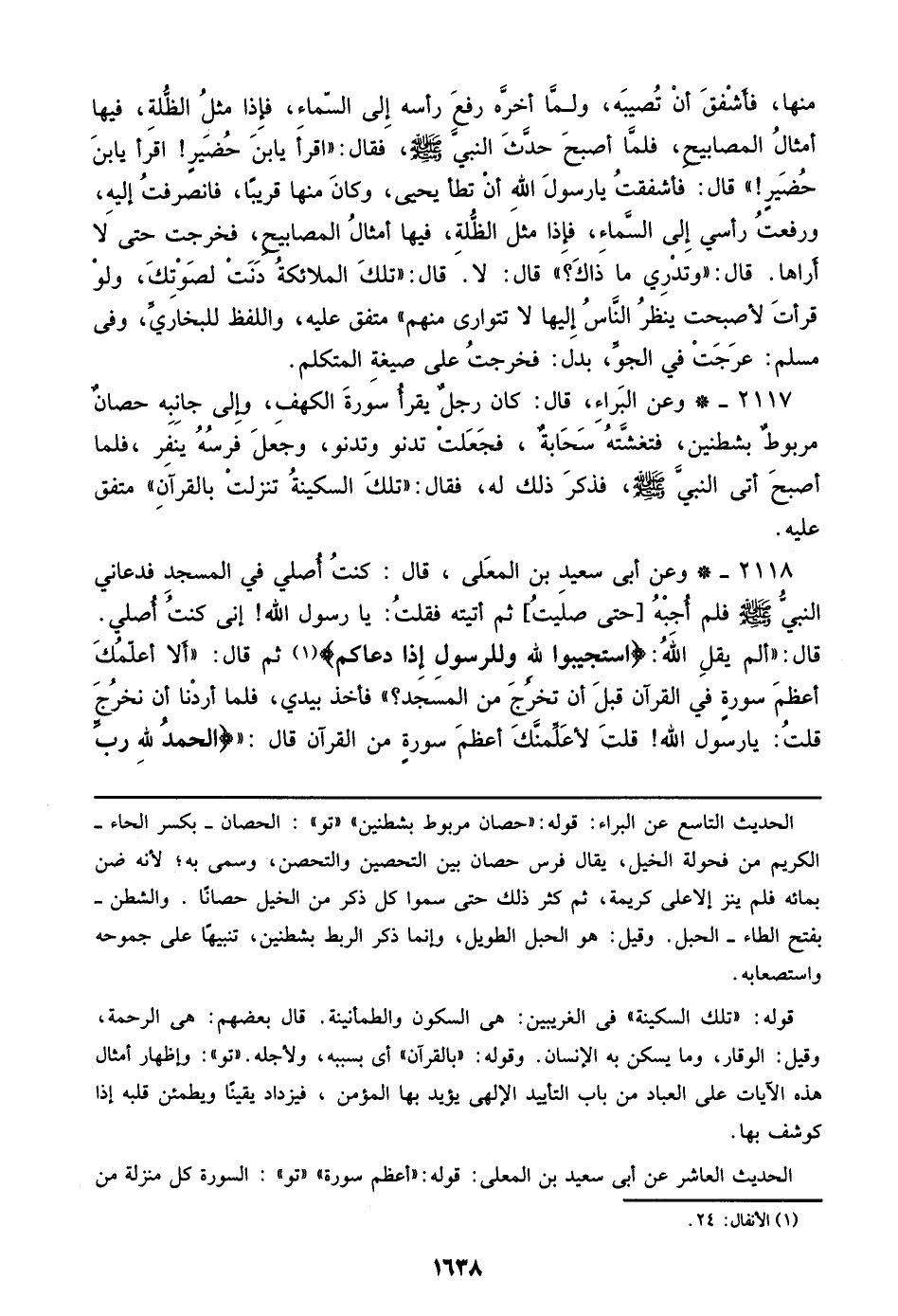 2117 - وعن البراء، قال: كان رجلٌ يقرأُ سورة الكهف، وإلي جانِبِه حصانٌ مربوطٌ بشطنين، فتغشَّتهُ سحَابةٌ، فجَعَلتْ تدنو وتدنو، وجعلَ فرسُهُ ينفِر، فلما أصبحَ أتى النبيَّ صلى الله عليه وسلم، فذكر ذلك له، فقال: ((تلكَ السكينةُ تنزلت بالقرآنِ)) متفق عليه.