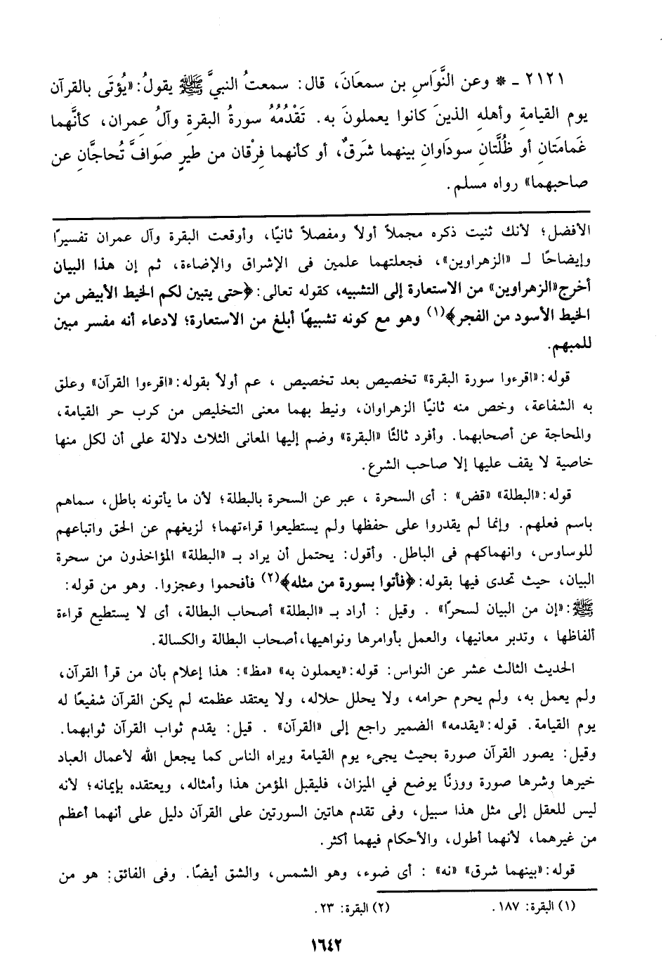 2121 - وعن النواس بن سمعان، قال: سمعت النبي صلى الله عليه وسلم يقول: ((يؤتى بالقرآن يوم القيامة وأهله الذين كانوا يعملون به. تقدمه سورة البقرة وآل عمران، كأنهما غمامتان أو ظلتان سوداوان بينهما شرق، أو كأنهما فرقان من طير صواف تحاجان عن صاحبهما)) رواه مسلم.