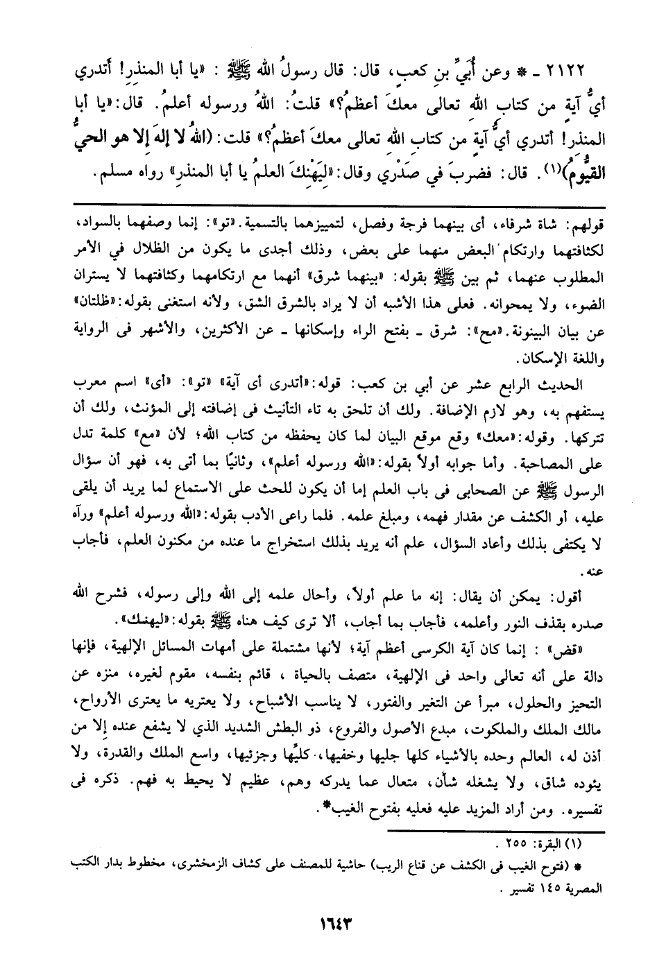 2122 - وعن أبي بن كعب، قال: قال رسول الله صلى الله عليه وسلم: ((يا أبا المنذر! أتدري أي آية من كتاب الله تعالي معك أعظم؟)) قلت: الله ورسوله أعلم. قال: ((يا أبا المنذر! أتدري أي آية من كتاب الله تعالي معك أعظم؟)) قلت: (الله لا إله إلا هو الحي القيوم). قال: فضرب في صدري وقال: ((ليهنك العلم يا أبا المنذر)) رواه مسلم.