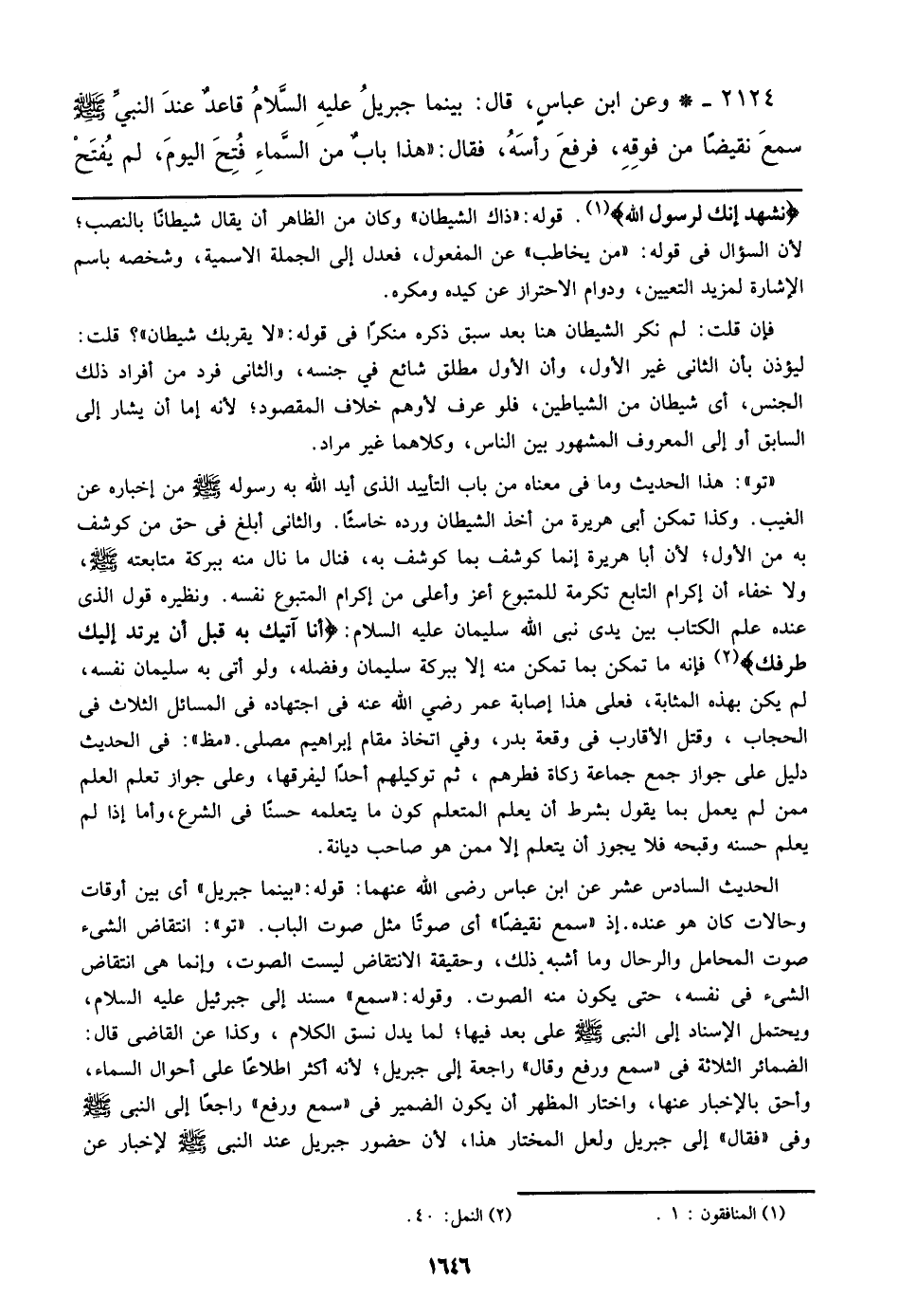 الحديث السادس عشر عن ابن عباس رضي الله عنهما: قوله: ((بينما جبريل)) أي بين أوقات وحالات كان هو عنده. إذ ((سمع نقيضاً)) أي صوتا مثل صوت الباب. ((تو)): انتقاض الشيء صوت المحامل والرحال وما أشبه ذلك، وحقيقة الانتقاض ليست الصوت، وإنما هي انتقاض الشيء في نفسه، حتى يكون منه الصوت. وقوله: ((سمع)) مسند إلي جبريل عليه السلام، ويحتمل الإسناد إلي النبي صلى الله عليه وسلم علي بعد فيها، لما يدل علي نسق الكلام، وكذا عن القاضي قال: الضمائر الثلاثة في ((سمع ورفع وقال)) راجعة إلي جبريل، لأنه أكثر اطلاعاً علي أحوال السماء، وأحق بالإخبار عنها، واختار المظهر أن يكون الضمير في ((سمع ورفع)) راجعاً إلي النبي صلى الله عليه وسلم وفي ((فقال)) إلي جبريل ولعل المختار هذا، لأن حضور جبريل عند النبي صلى الله عليه وسلم لإخبار عن