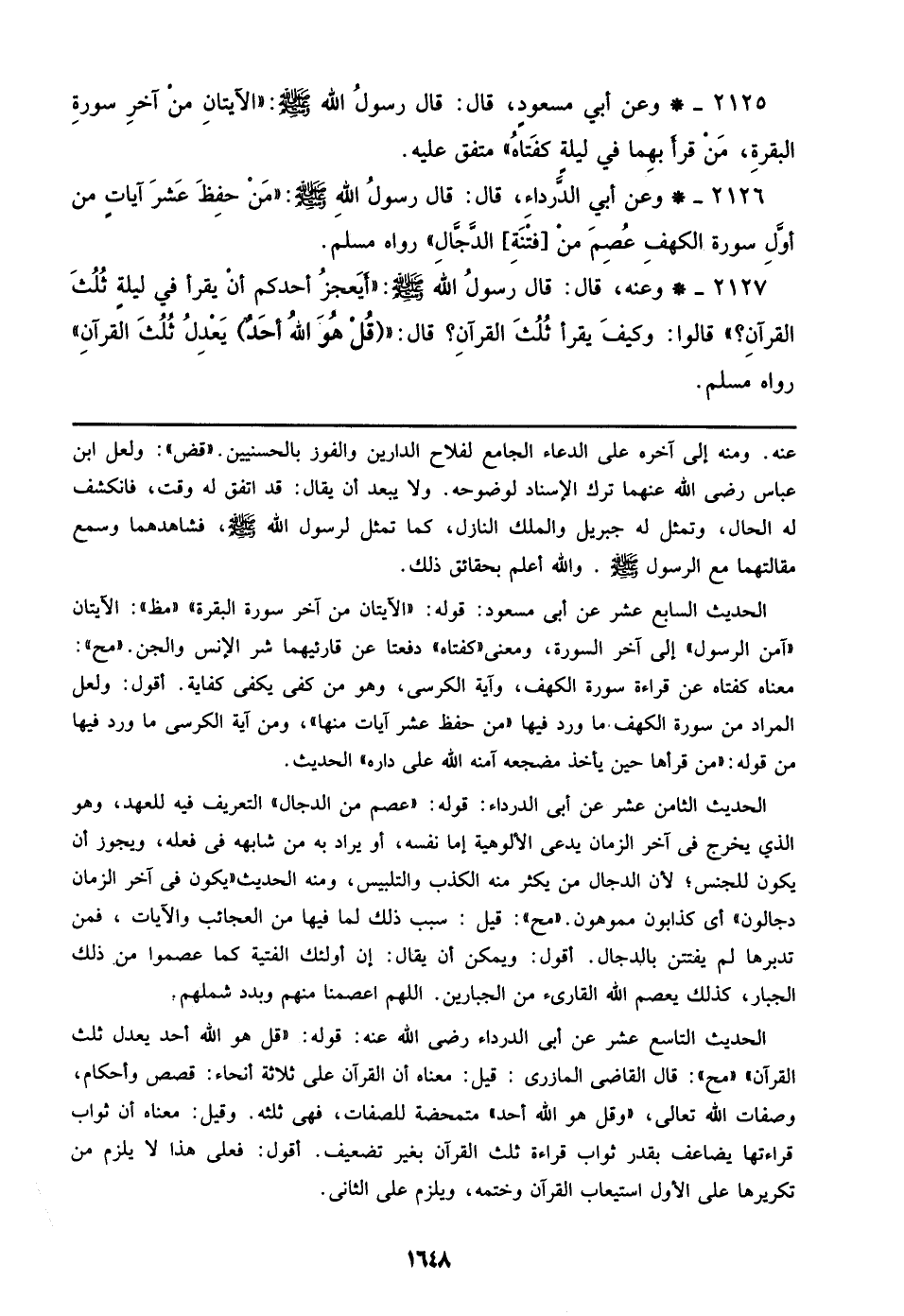 2125 - وعن أبي مسعود، قال: قال رسول الله صلى الله عليه وسلم: ((الآيتان من آخر سورة البقرة، من قرأ بهما في ليلة كفتاه)) متفق عليه.