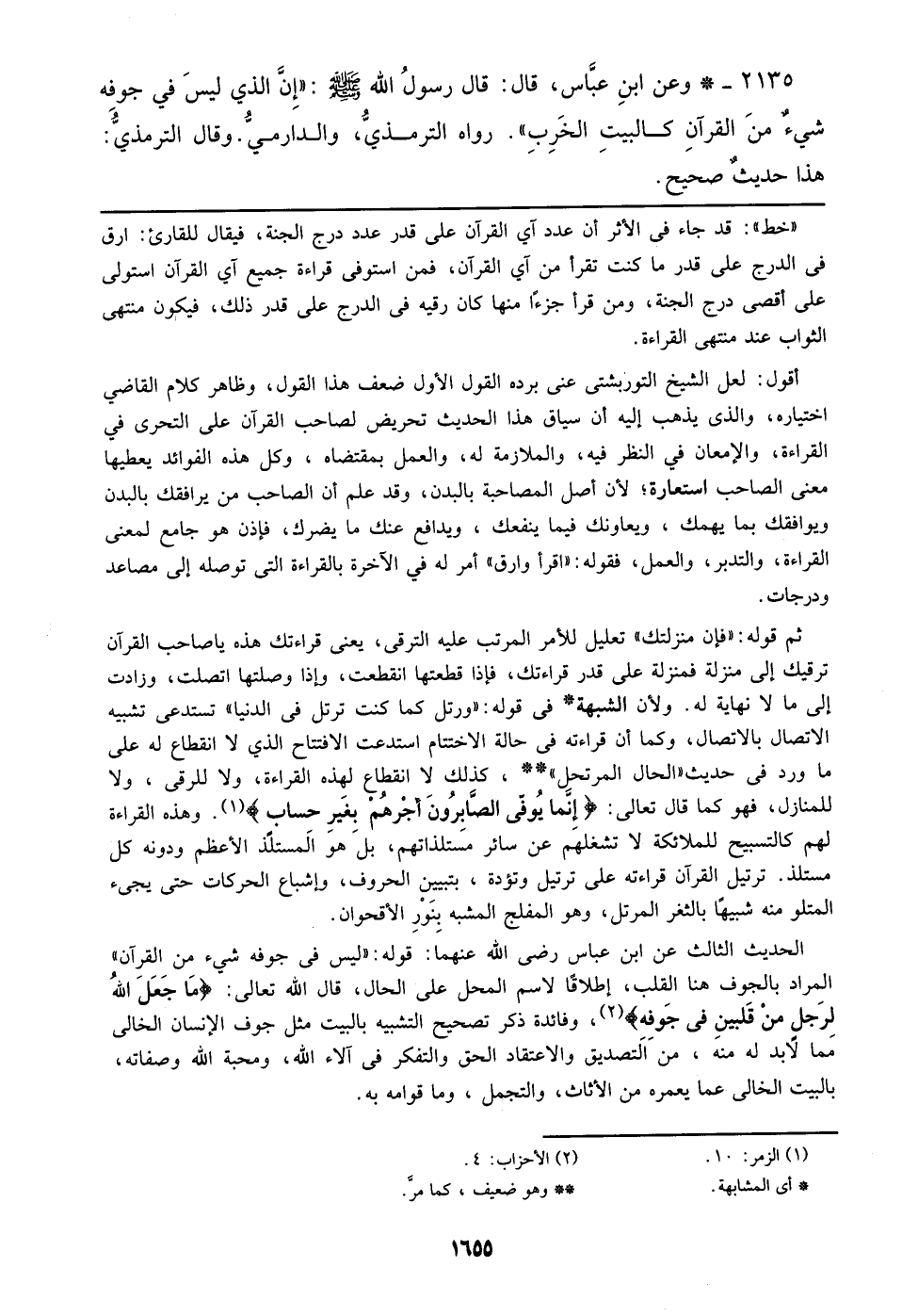 2135 - وعن ابن عباس، قال: قال رسول الله صلى الله عليه وسلم: ((إن الذي ليس في جوفه شيء من القراَن كالبيت الخراب)). رواه الترمذى، والدرامى. وقال الترمذى: هذا حديث صحيح.