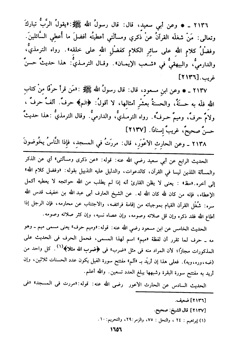 2136 - وعن أبي سعيد، قال: قال رسول الله صلى الله عليه وسلم: ((يقول الرب تبارك وتعالي: من شغله القراَن عن ذكرى ومسالتي أعطيته أفضل ما أعطى السائلين. وفضل كلام الله علي سائر الكلام كفضل الله علي خلقه)). رواه الترمذى، والدارمى، والبيهقي في ((شعب الإيمان)). وقال الترمذى: هذا حديث حسن غريب. . [2136]
