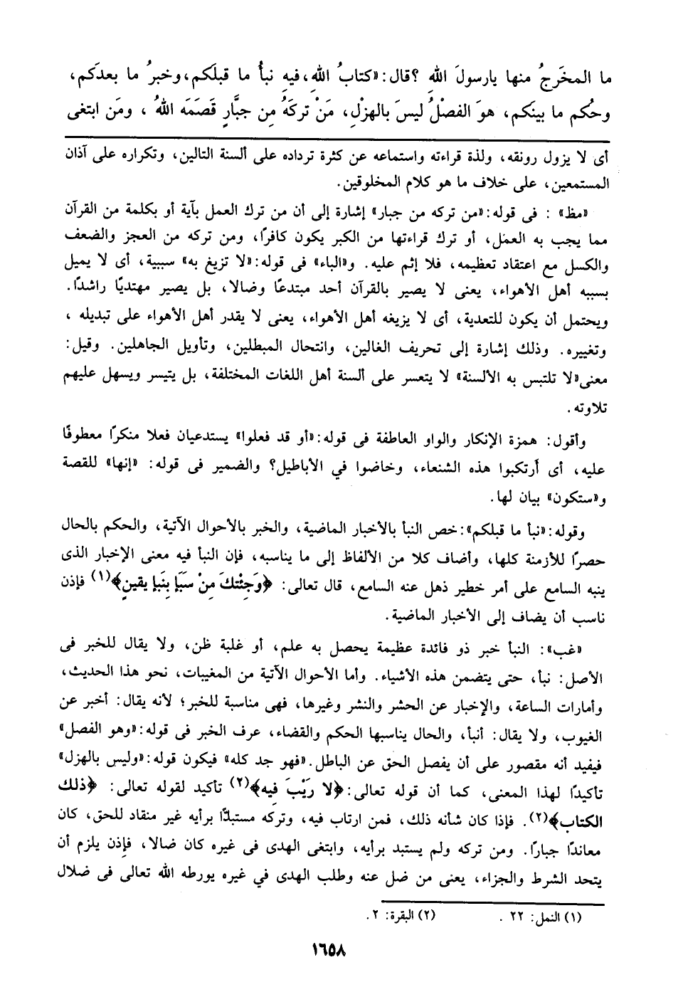((غب)): النبأ خبر ذو قائدة عظيمة يحصل به علم، أو غلبة ظن، ولا يقال للخبر في الاصل نبأ، حتى يتضمن هذه الاشياء. وأما الاحوال الآتية من المغيبات، نحو هذا الحديث وأمارات الساعة، والاخبار عن الحشر والنشر وغيرها، فهي مناسبة للخبر؛ لانه يقال: أخبر عن الغيوب، ولا يقال: أنبأ، والحال يناسبها الحكم والقضاء، عرف الخبر في قوله: ((وهو الفصل)) فيفيد أنه مقصور علي أن يفصل الحق عن الباطل. ((فهو جد كله)) فيكون قوله: ((وليس بالهزل)) تاكيداً لهذا المعنى، كما أن قوله تعالي {لا ريب فيه} تأكيد لقوله تعالي: {ذلك الكتاب}. فاذا كان شأنه ذلك، فمن ارتاب فيه، وتركه مستبداً برأيه غير منقاد للحق، كان معانداً جباراً. ومن تركه ولم يستبد برأيه، وابتغى الهدى في غيره كان ضالاً، فإذن يلزم أن يتحد الشرط والجزاء، يعنى من ضل عنه وطلب الهدى في غيره يورطه الله تعالي في ضلال