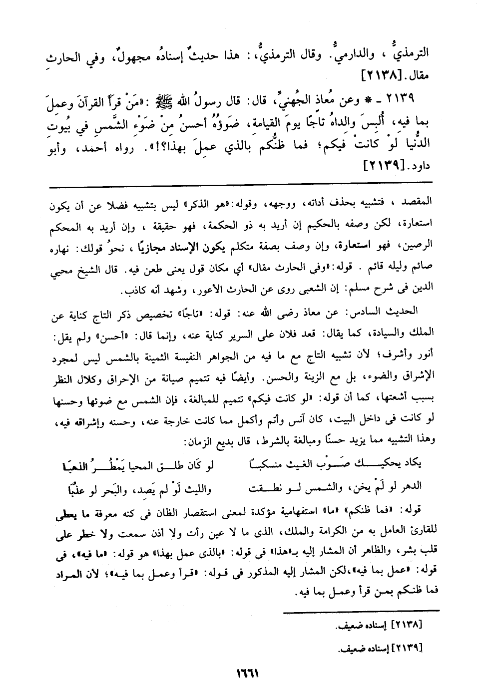 2139 - وعن مُعاذ الجهنى، قال: قال رسول الله صلى الله عليه وسلم: ((من قرأ القرآن وعمل بما فيه، ألبس والداه تاجاً يوم القيامة، ضوؤه أحسن من ضوء الشمس في بيوت الدنيا لو كانت فيكم؛ فما ظنكم بالذي عمل بهذا؟!)). رواه أحمد، وأبوداود. [2139]