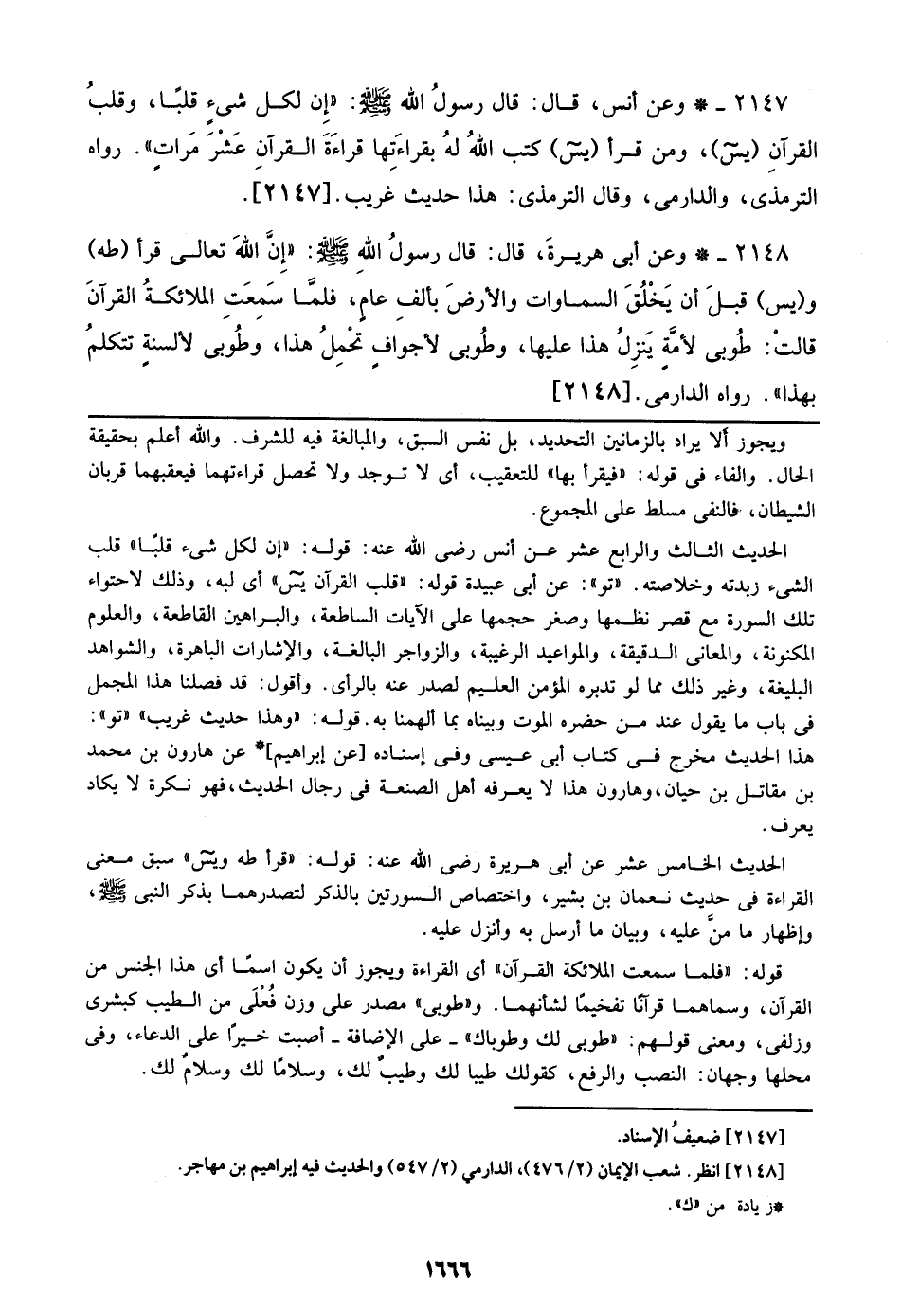 2147 - وعن أنس، قال: قال رسول الله صلى الله عليه وسلم: ((إن لكل شيء قلباً، وقلب القراَن (يسَ)، ومن قرأ (يسَ) كتب الله له بقراءتها قراءة القراَن عشر مرات)). رواه الترمذى، والدرامى، وقال الترمذى: هذا الحديث غريب. [2147]