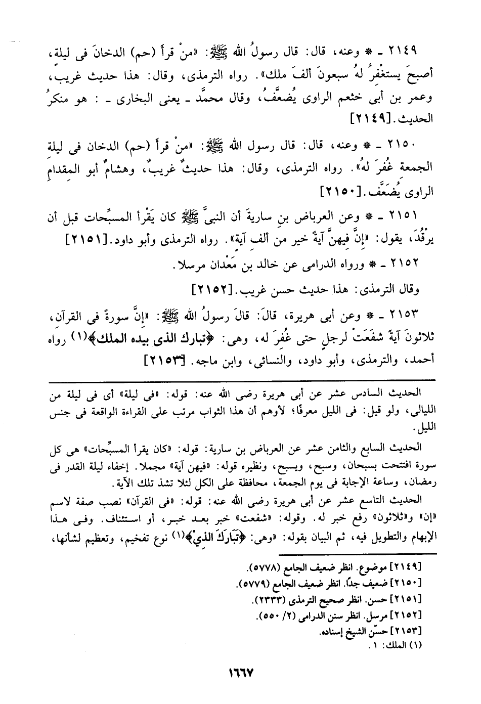 2153 - وعن أبي هريرة، قال: قال رسول الله صلى الله عليه وسلم: ((إن سورة في القراَن، ثلاثون اَية شفعت لرجل حتى غفر له، وهي: {تبارك الذي بيده الملك} رواه أحمد، والترمذى، وأبوداود، والنسائى، وابن ماجه. [2153]