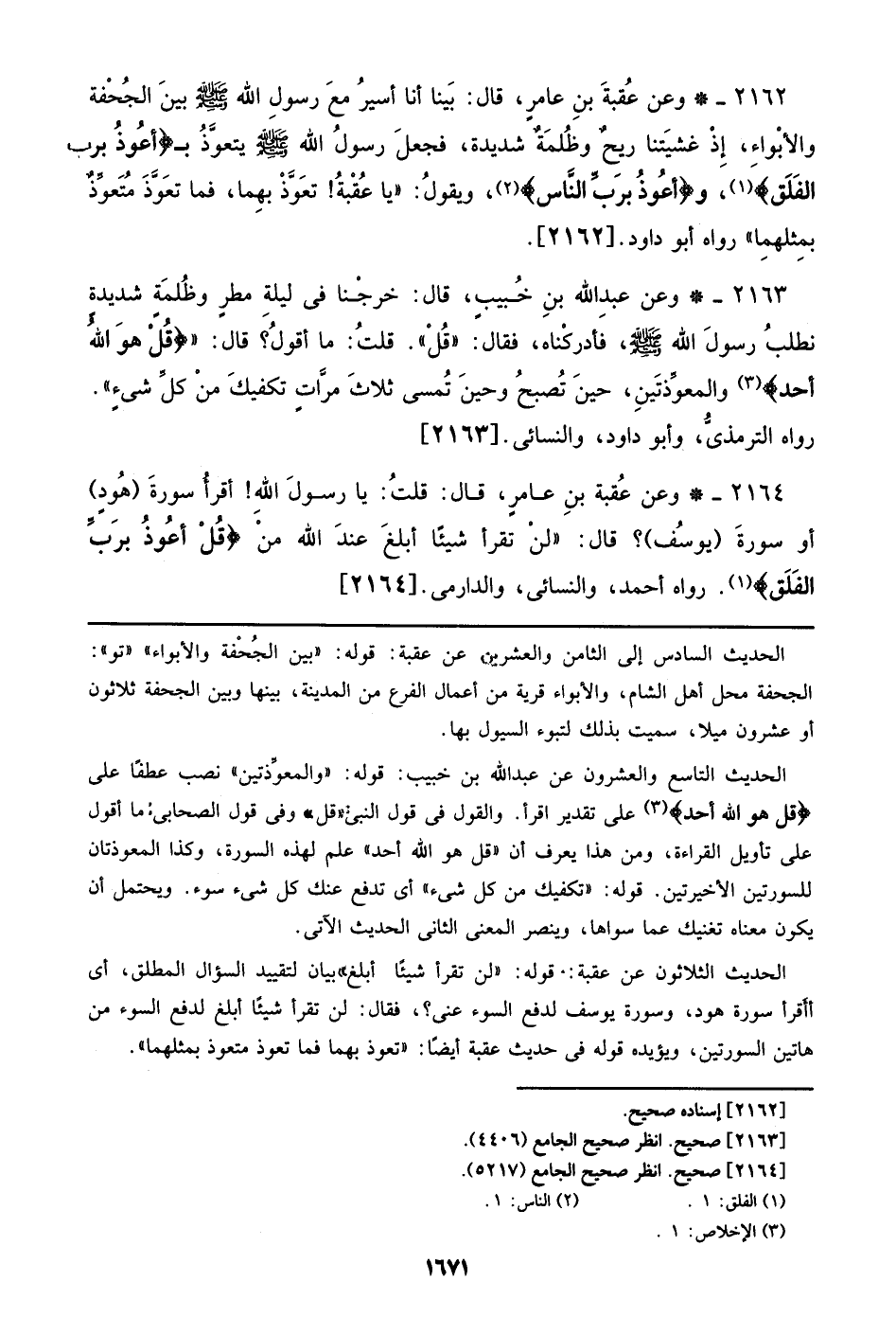 2162 - وعن عقبة بن عامر، قال: بينا أنا أسير مع رسول الله صلى الله عليه وسلم بين الجحفة والابواء، إذ غشيتنا ريح وظلمتة شديدة، فجعل رسول الله صلى الله عليه وسلم صلى الله عليه وسلم يتعوذ بـ {أعوذ برب الفلق}، و {أعوذ برب الناس}، ويقول: ((ياعقبةّ! تعوذبهما، فما تعوذ متعوذ بمثلهما)) رواه أبوداود. [2162]