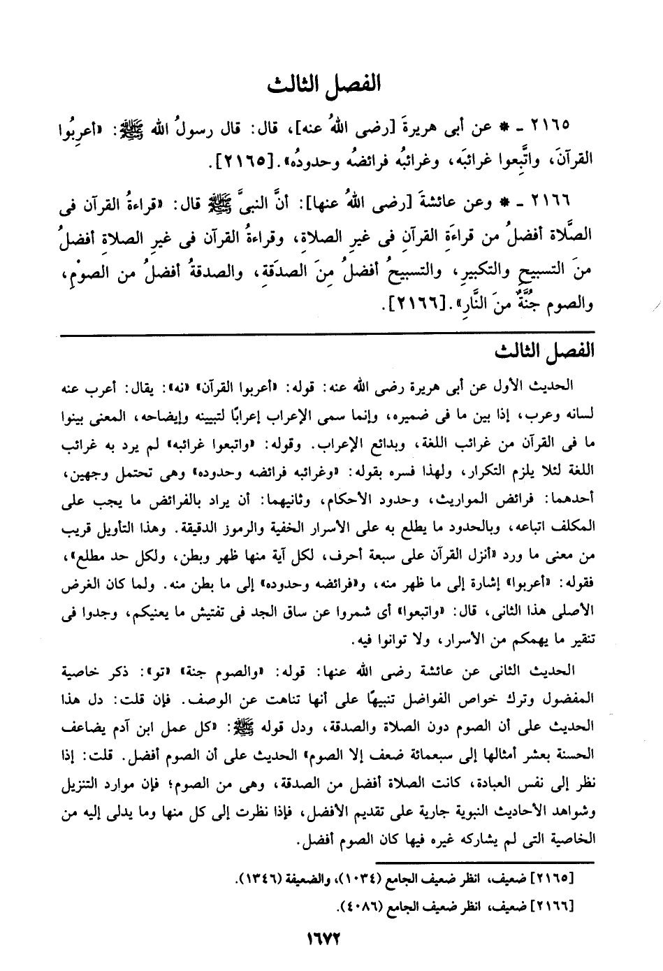 2165 - عن أبي هريرة [رضي الله عنه]، قال: قال رسول الله صلى الله عليه وسلم: ((أعربوا القراَن، واتبعوا غرائبه، وغرائبه فرائضه وحدوده)). [2165]