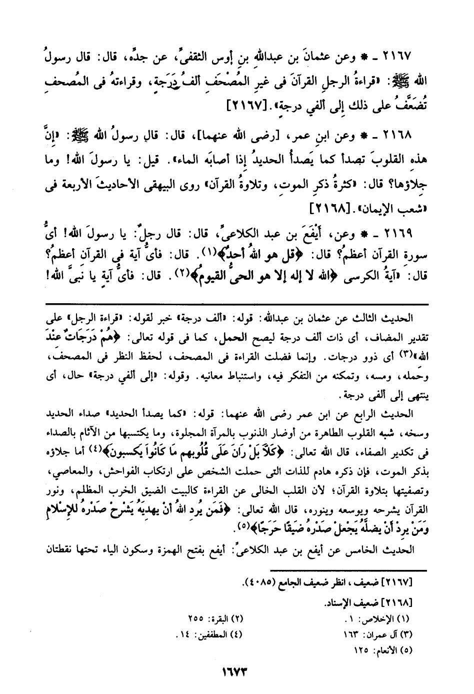 2169 - وعن، أيفع بن عبد الكلاعى، قال: قال رجل: يارسول الله! أي سورة القراَن أعظم؟ قال: {قل هو الله أحد}. قال: فأي اَية في القراَن أعظم؟ قال: ((اَية الكرسى {الله لا إله هو الحى القيوم}. قال: فأي اَية يانبى الله!