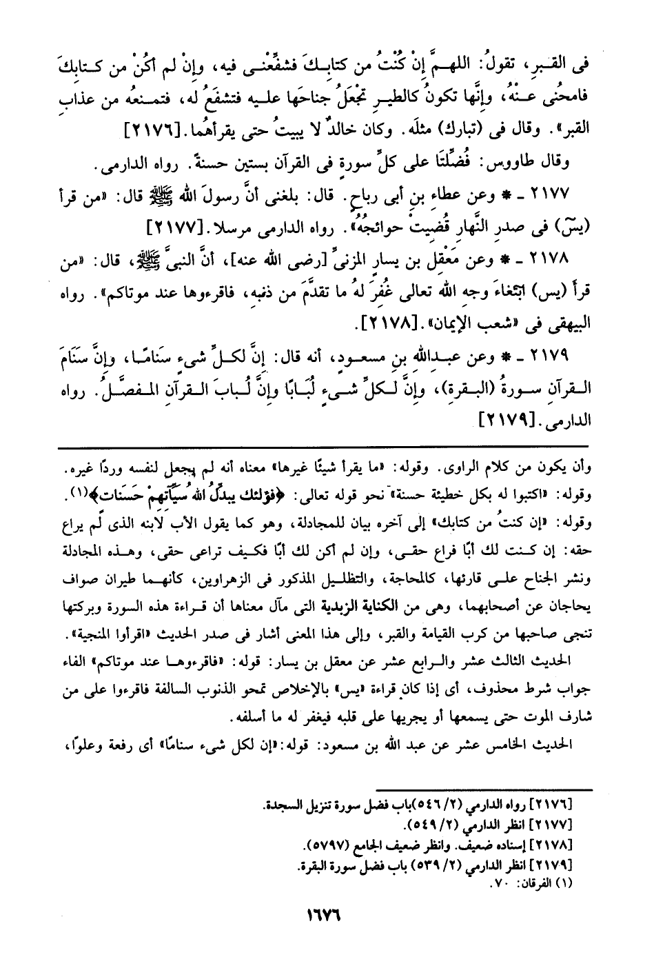 2179 - وعن عبدالله بن مسعود، أنه قال: إن لكل شيء سناماً، وإن سنام القراَن سورة (البقرة)، وإن لكل شيء لباباً وإن لباب القراَن المفصل. رواه الدارمى. [2179].