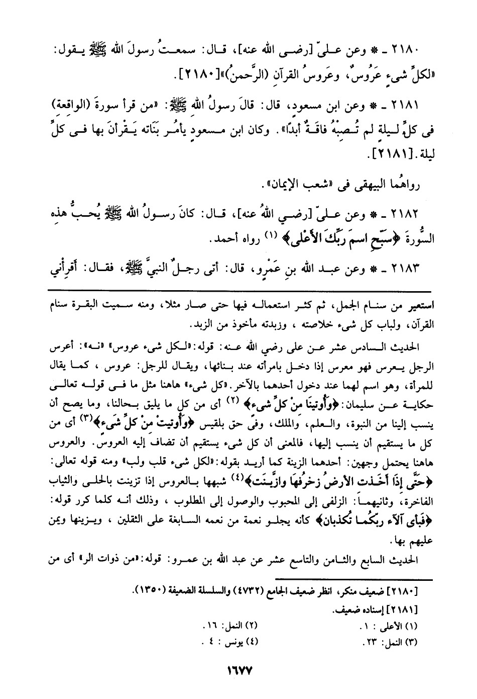 2180 - وعن علي [رضي الله عنه]، قال: سمعت رسول الله صلى الله عليه وسلم يقول: ((لكل شيء عروس، وعروس القراَن (الرحمن))) [2180].
