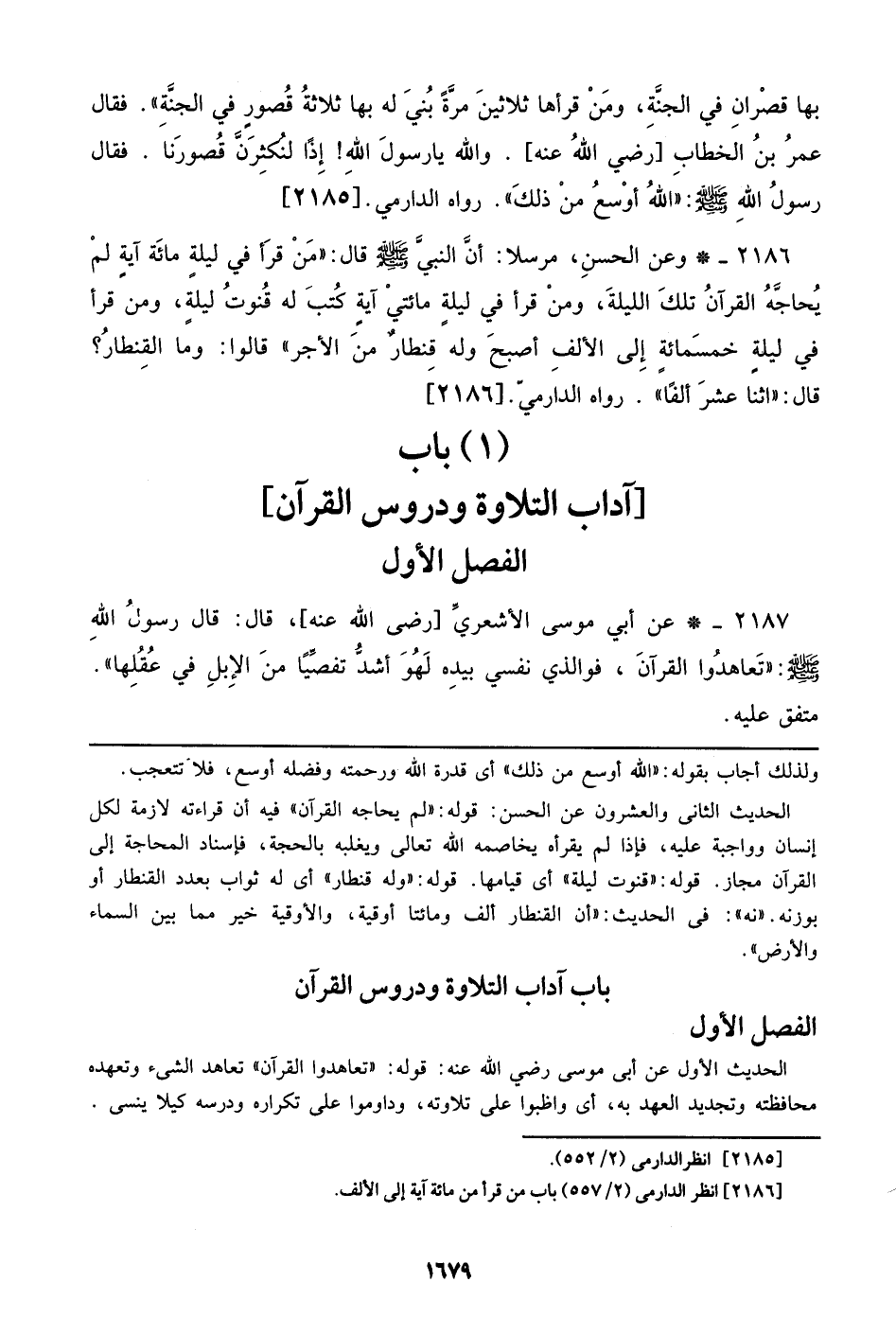 2187 - عن أبي موسى الاشعرى رضي الله عنه، قال: قال رسول الله صلى الله عليه وسلم: ((تعاهدوا القرآن، فوالذي نفسي بيده لنر أشذ تفصيأ من الإبل في عقلها)). متفق عليه.