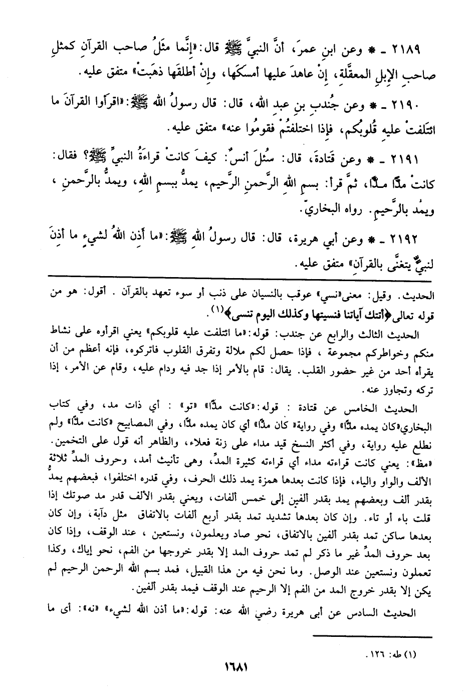 2189 - وعن ابن عمر، أن النبي صلى الله عليه وسلم قال: ((إنما مثل صاحب القرآن كمثل صاحب الإبل المعلقة، إذ عاهد عليها امسكها، وإذ أطلقها ذهبت)) متفق عليه.