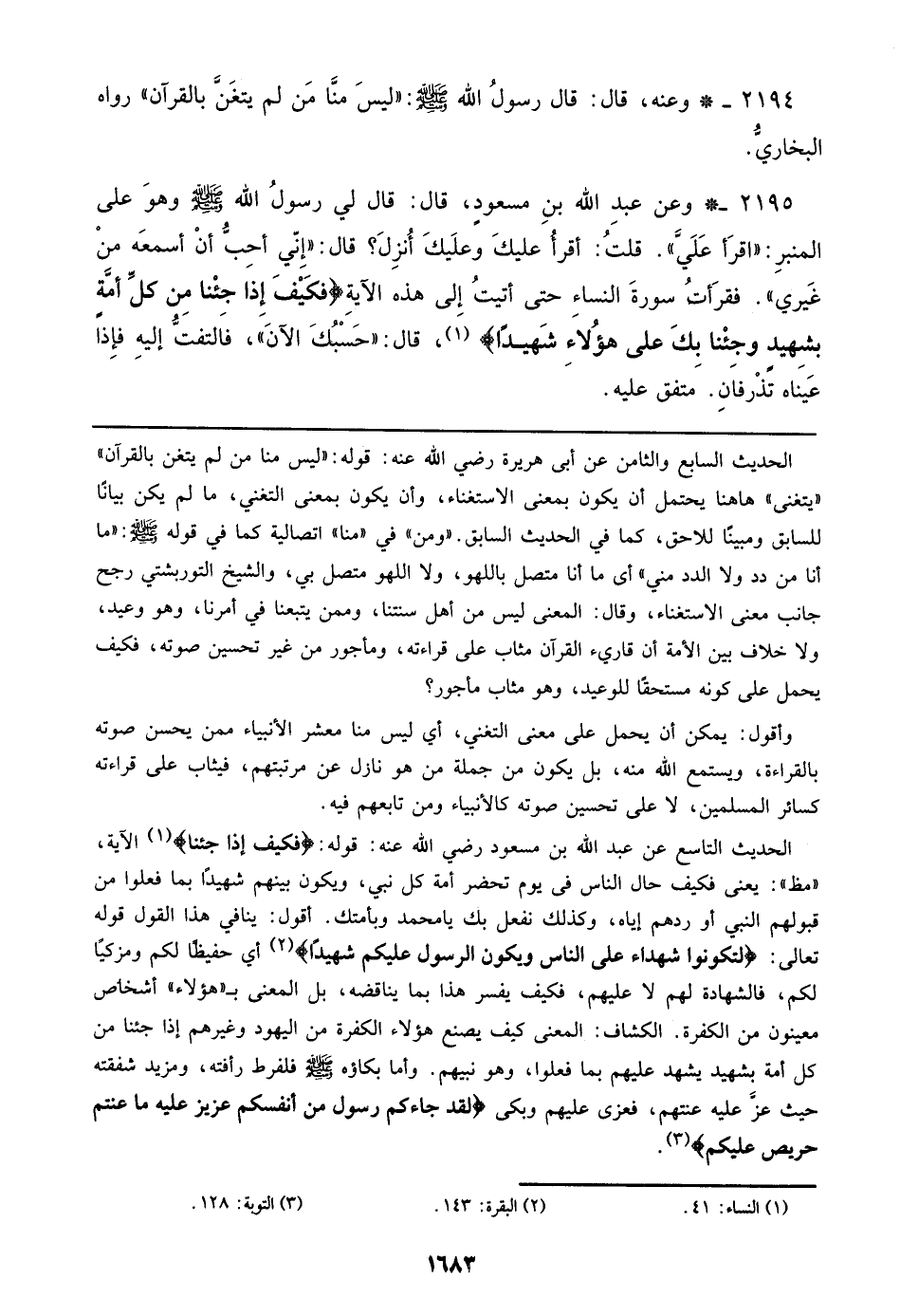 2195 - وعن عبدالله بن مسعود، قال: قال لي رسول الله صلى الله عليه وسلم وهو علي المنبر: ((اقرأ علي)). قلت: أقرأ عليك وعليك أنزل؟ قال: ((إنى أحب أسمعه من غيرى)). فقرأت سورة النساء حتى أتيت إلي هذه الأية {فكيف إذا جئنا من كل أمه بشهيد وجئنا بك عى هؤلاء شهيداً}، قال: ((حسبك الاَن))، فالتفت إليه فإذا عيناه تذرفان. متفق عليه.