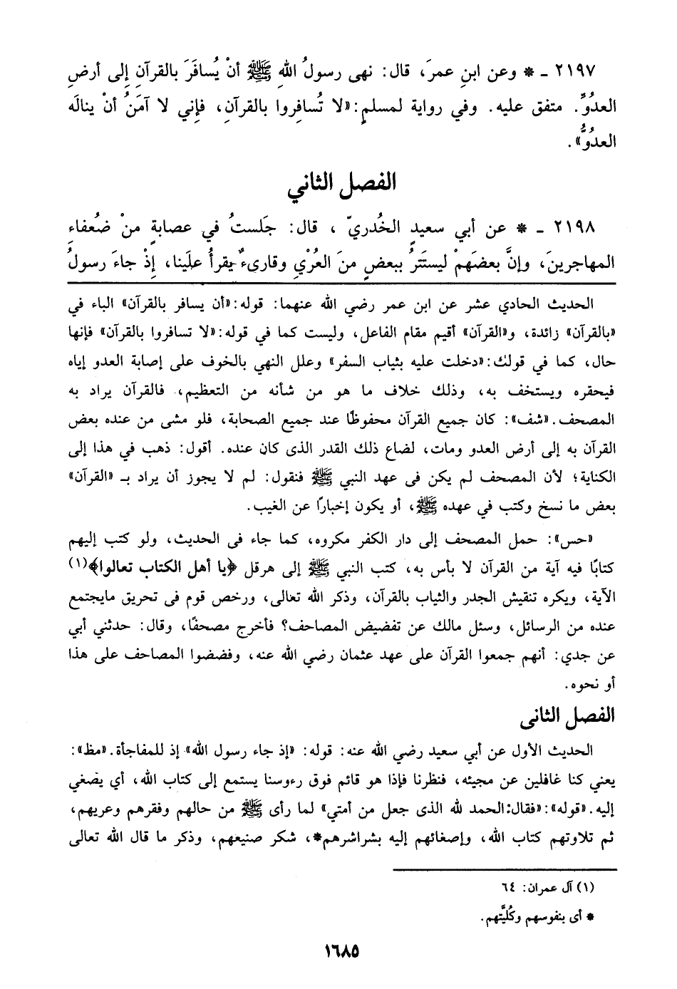 2197 - وعن ابن عمر، قال: نهي رسول الله صلى الله عليه وسلم أن يسافر بالقراَن إلي أرض العدو. متفق عليه. وفي رواية لمسلم: ((لا تسافروا بالقراَن، فإنى لا اَمن أن يناله العدو)).