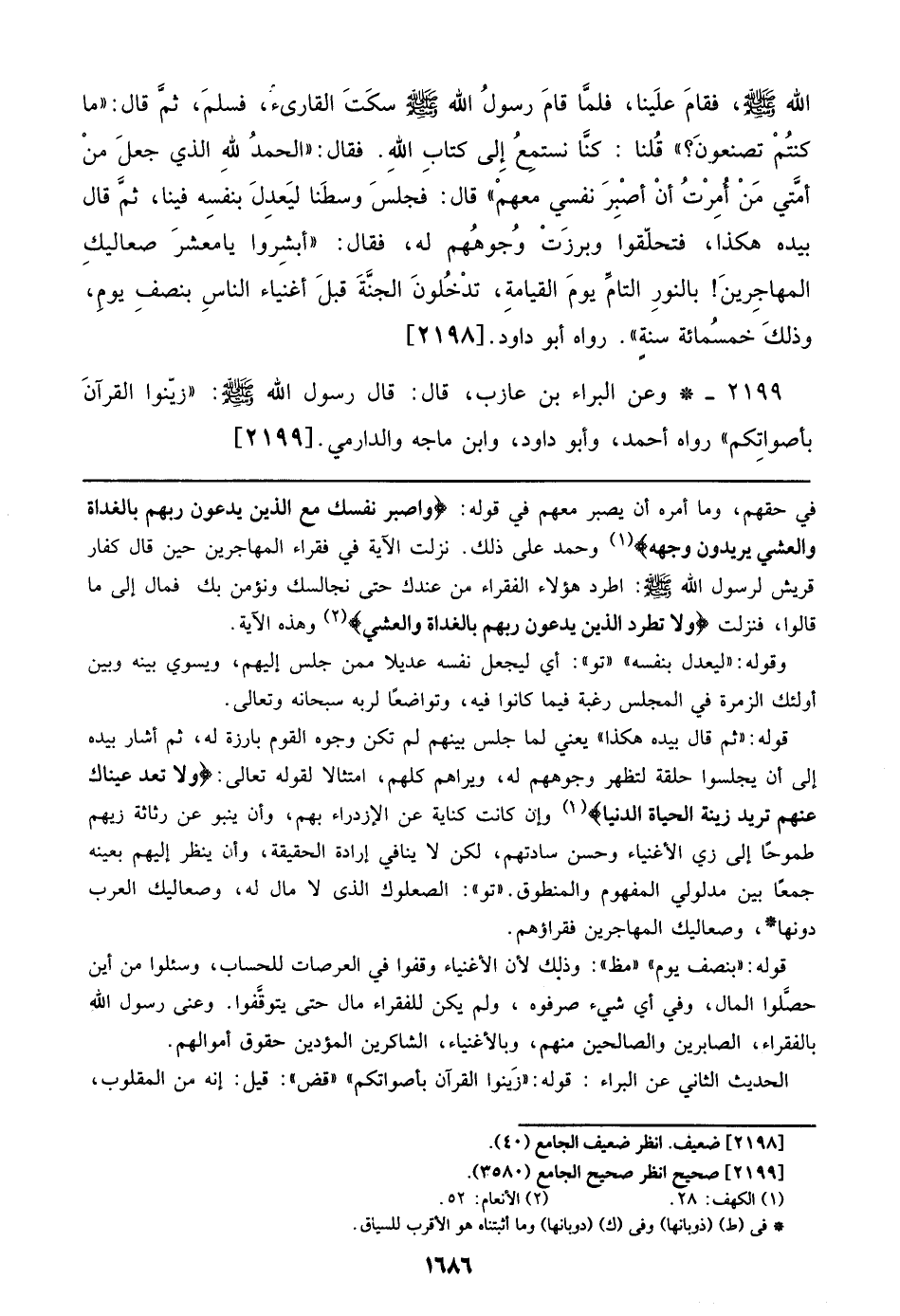 2199 - وعن البراء بن عازب، قال: قال رسول الله صلى الله عليه وسلم: ((زينوا القراَن بأصواتكم)) رواه أحمد، وأبوداود، وابن ماجه والدارمى. [2199].