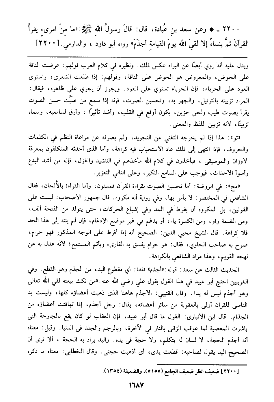 ((تو)): هذا إذا لم يخرجه التغنى عن التجويد، ولم يصرفه عن مراعاة النظم في الكلمات والحروف، فإذا انتهي إلي ذلك عاد الاستحباب فيه كراهة، وأما الذي أحدثه المتكلفون بمعرفة الأوزان والموسيقى، فيأخذون في كلام الله مأخذهم في التنشيد والغزل، فإنه من أشد البد وأسوأ الأحداث، فيوجب علي السامع النكير، وعلي التالي التعزيز.