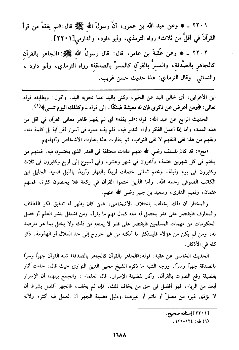2201 - وعن عبد الله بن عمرو، أن رسول الله صلى الله عليه وسلم قال: ((لم يفقه من قرأ القراَن في أقل من ثلاث)) رواه الترمذى، وأبوداود، والدارمى [2201].