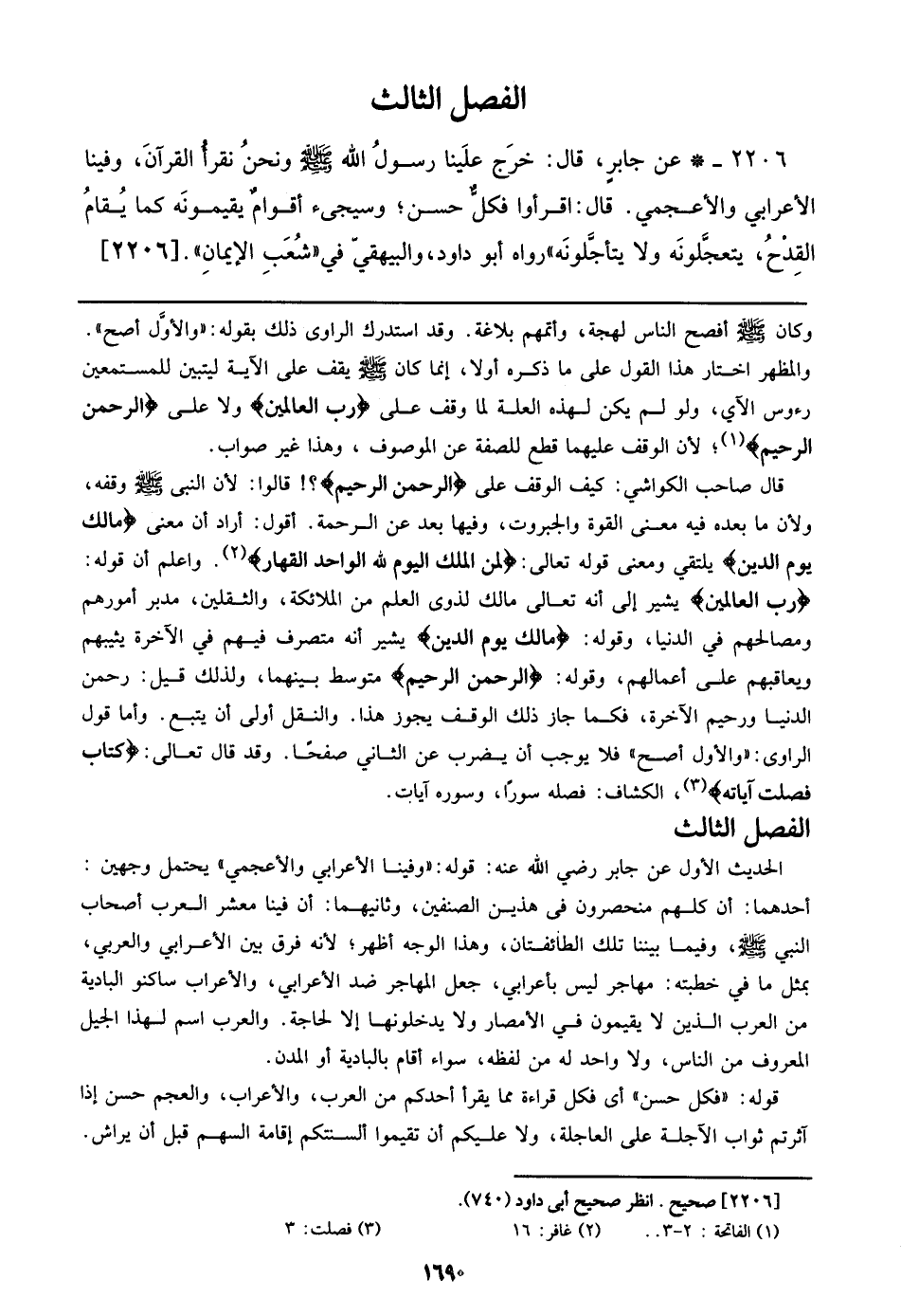 2206 - عن جابر، قال: خرج علينا رسول الله صلى الله عليه وسلم ونحن نقرأ القراَن، وفينا الأعرأبي والأعجمى. قال: اقرأوا فكل حسن؛ وسيجئ أقوام يقيمونه كما يقام القدح، يتعلجونه ولا يتأجلونه)) رواه أبوداود، والبيهقى في ((شعب الإيمان)). [2206].