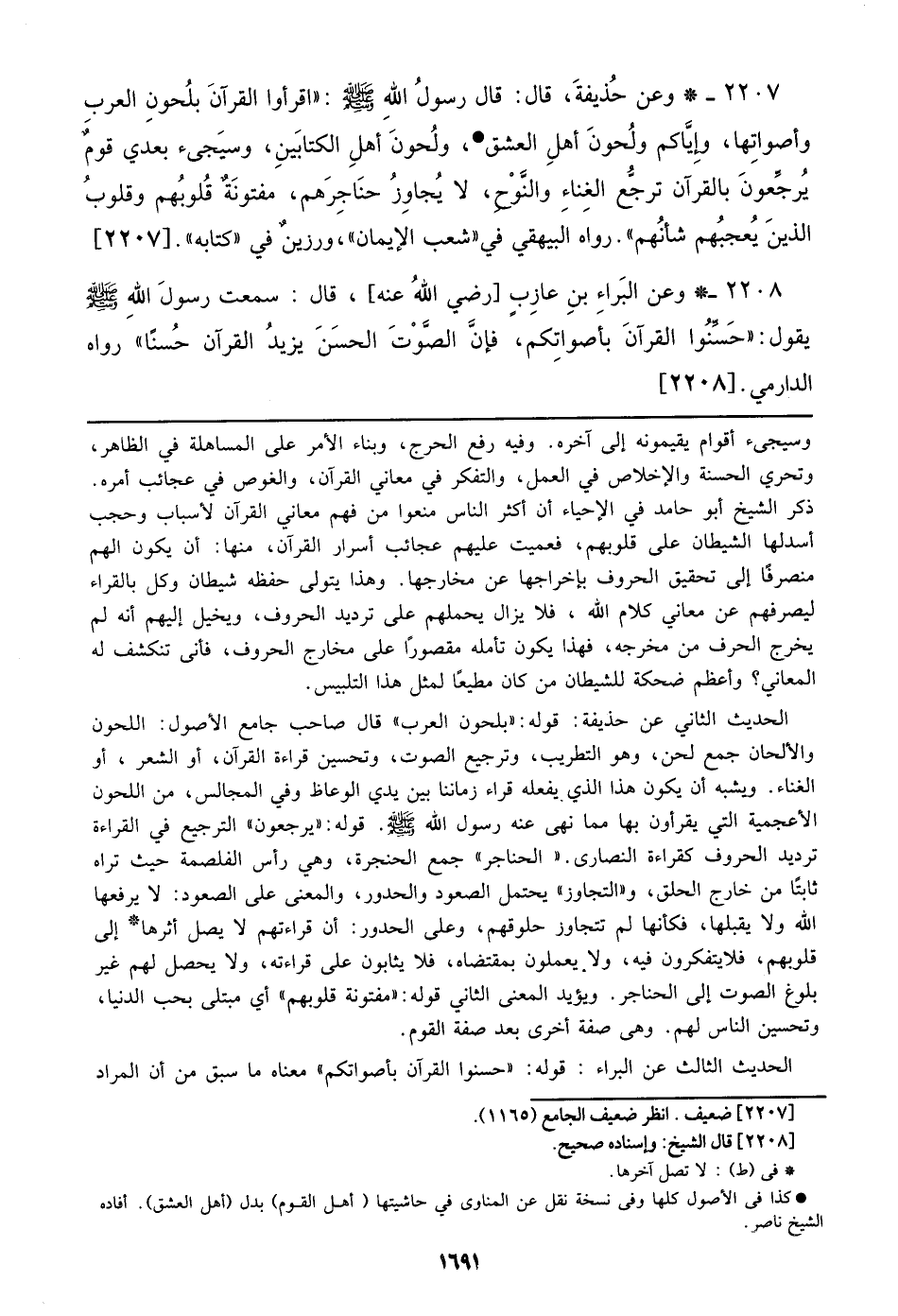 2207 - وعن حذيفة، قال: قال رسول الله صلى الله عليه وسلم: ((اقرأوا القرآن بلحون العرب وأصواتها، وإياكم ولحون أهل العشق*، ولحون أهل الكتابين، وسيجىء بعدي قومٌ يرجعون بالقرآن ترجع الغناء والنوح، لا يجاوز حناجرهم، مفتونة قلوبهم وقلوب الذين يعجبهم شأنهم)). رواه البيهقي في ((شعب الإيمان))، ورزينٌ في ((كتابه)). [2207]