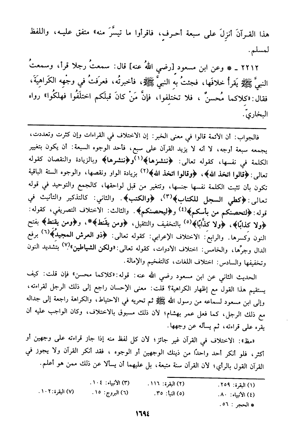 2212 - وعن ابن مسعود [رضي الله عنه] قال: سمعت رجلا قرأ، وسمعت النبي صلى الله عليه وسلم يقرأ خلافها، فجئت به النبي صلى الله عليه وسلم، فأخبرته، فعرفت في وجهه الكراهية، فقال: ((كلاكما محسن، فلا تختلفوا، فإن من كان قبلكم اختلفوا فهلكوا)) رواه البخاري.