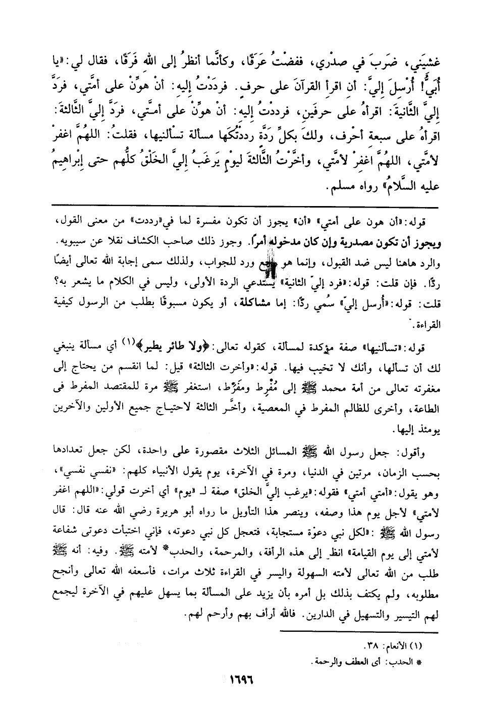 غشيني، ضرب في صدري، ففضت عرقاً، وكأنما أنظر إلي الله فرقاً، فقال لي: ((يا أبي! أرسل إلي: أن اقرأ القرآن علي حرف. فرددت إليه: أن هون علي أمتي، فرد إلي الثانية: اقرأه علي حرفين، فرددت إليه: أن هون علي أمتي، فرد إلي الثالثة: اقرأه علي سبعة أحرف، ولك بكل ردة رددتكها مسألة تسألينها، فقلت: اللهم اغفر لأمتي، اللهم اغفر لأمتي، وأخرت الثالثة ليوم يرغب إلي الخلق كلهم حتى إبراهيم عليه السلام)) رواه مسلم.