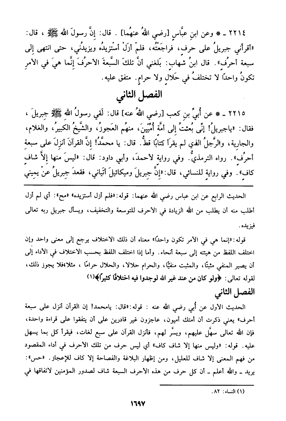 2214 - وعن ابن عباس [رضي الله عنهما]. قال: إنَّ رسول الله صلى الله عليه وسلم، قال: ((أقرإني جبريل علي حرف، فراجعته، فلم أزل أستزيده ويزيدني، حتى انتهي إلي سبعة أحرف)). قال ابن شهاب: بلغني أن تلك السبعة الأحرف إنما هي في الأمر تكون واحداً لا تختلف في حلال ولا حرام. متفق عليه.