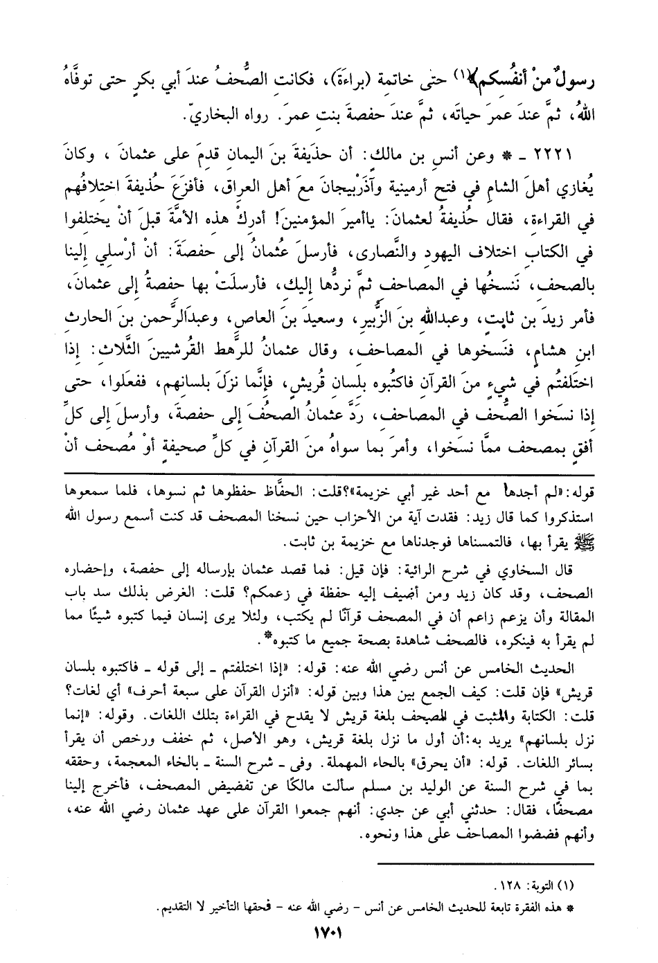 2221 - وعن أنس بن مالك: أن حذيفة بن اليمان قدم علي عثمان، وكان يغازي أهل الشام في فتح أرمينية وأذربيجان مع أهل العراق، فأفزع حذيفة اختلافهم في القراءة، فقال حذيفة لعثمان: يا أمير المؤمنين أدرك هذه الأمة قبل أن يختلفوا في الكتاب اختلاف اليهود والنصارى، فأرسل عثمان إلي حفصة: أن أرسلي إلينا بالصحف، ننسخها في المصاحف ثم نردها إليك، فأرسلت بها حفصة إلي عثمان، فأمر زيد بن ثابت، وعبد الله بن الزبير، وسعيد بن العاص، وعبد الرحمن بن الحارث ابن هشام، فنسخوها في المصاحف، وقال عثمان للرهط القرشيين الثلاث: إذا اختلفتم في شيء من القرآن فاكتبوه بلسان قريش، فإنما نزل بلسانهم، ففعلوا، حتى إذا نسخوا الصحف في المصاحف، رد عثمان الصحف إلي حفصة، وأرسل إلي كل أفق بمصحف مما نسخوا، وأمر بما سواه من القرآن في كل صحيفة أو مصحف أن