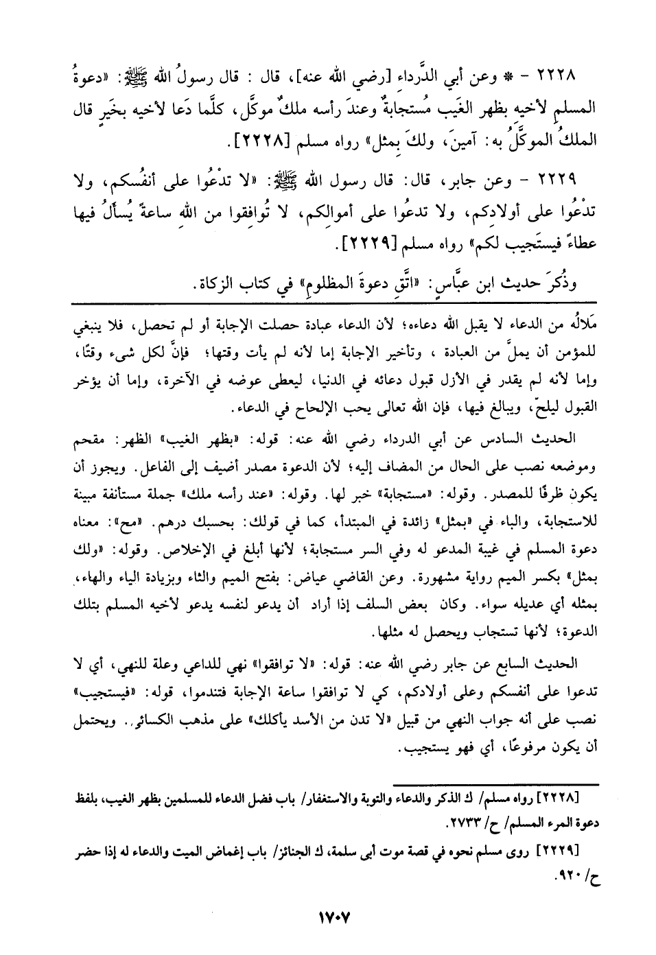 الحديث السادس عن أبي الدرداء رضي الله عنه: قوله: ((بظهر الغيب)) الظهر: مقحم وموضعه نصب علي الحال من المضاف إليه؛ لأن الدعوة مصدر أضيف إلي الفاعل. ويجوز أن يكون ظرفا للمصدر. وقوله: ((مستجابة)) خير لها. وقوله ((عند رأسه ملك)) جملة مستأنفة مبينة للاستجابة، والباء في ((بمثل)) زائدة في المبتدأ، كما في قولك: بحسبك درهم. ((مح)): معناه دعوة المسلم في غيبة المدعو له وفي السر مستجابة؛ لأنها أبلغ في الإخلاص. وقوله: ((ولك بمثل)) بكسر الميم رواية مشهورة, وعن القاضي عياض: بفتح الميم والثاء وبزيادة الياء والهاء، بمثله أي عديله سواء, وكان بعض السلف إذا أراد أن يدعو لنفسه يدعو لأخيه المسلم بتلك الدعوة؛ لأنها تستجاب ويحصل له مثلها.