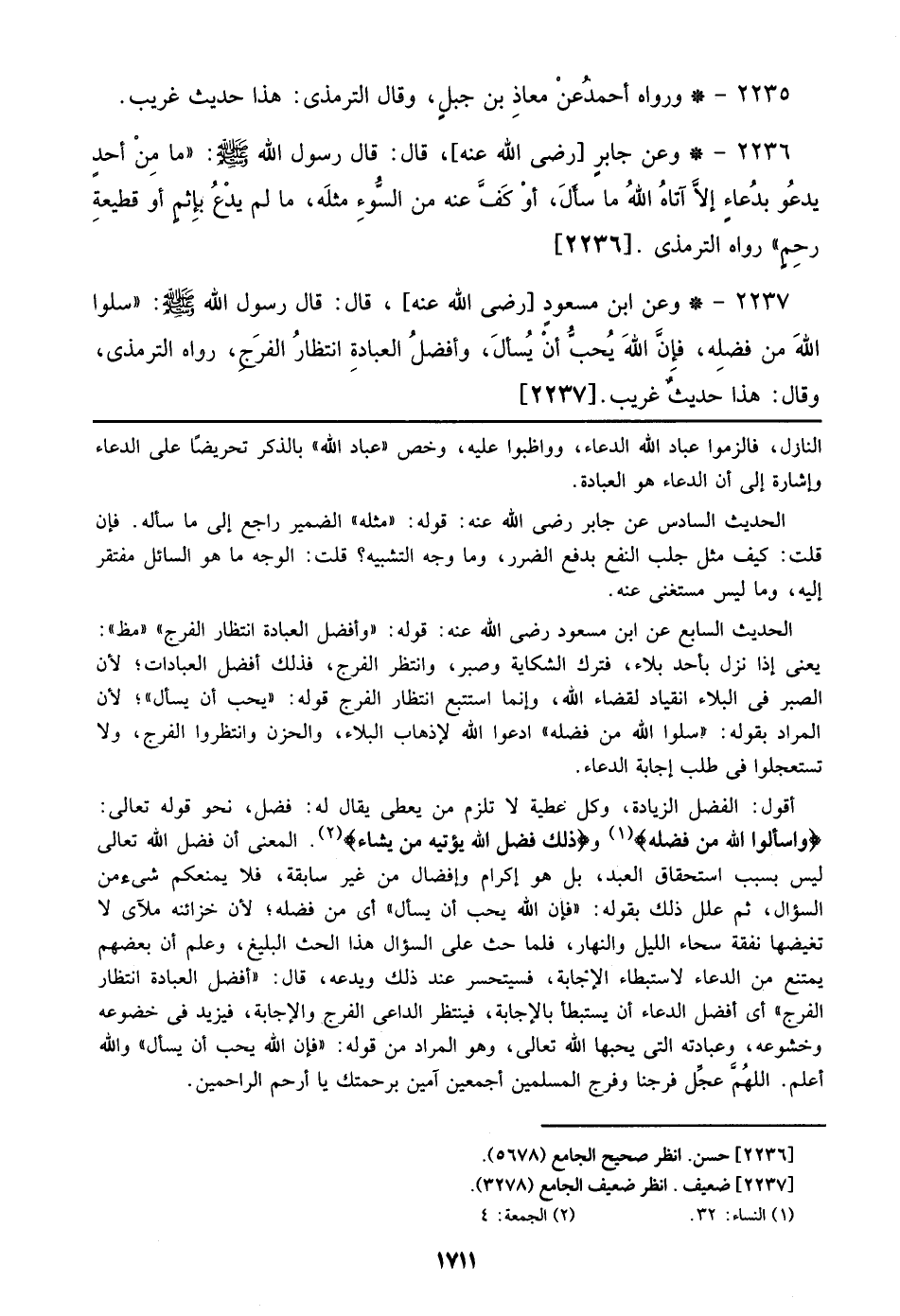أقول: الفضل الزيادة، وكل عطية لا تلزم من يعطي يقال له: فضل، نحو قوله تعالي {واسألوا الله من فضله} و {ذلك فضل الله يؤتيه من يشاء}. المعنى أن فضل الله تعالي ليس بسبب استحقاق العبد، بل إكرام وإفضال من غير سابقة، فلا يمنعكم شيء من السؤال، ثم علل ذلك بقوله: ((فإن الله يحب أن يسأل)) أي من فضله؛ لأن خزانته ملأي لا تغيضها نفقة سحاء الليل والنهار، فلما حث علي السؤال هذا الحث البليغ، وعلم أن بعضهم يمتنع من الدعاء لاستبطاء الإجابة، فسيتحسر عند ذلك ويدعه، قال: ((أفضل العبادة انتظار الفرج)) أي أفضل الدعاء أن يستبطأ بالإجابة، فينتظر الداعي الفرج والإجابة، فيزيد في خضوعه وخشوعه، وعبادته التي يحبها الله تعالي، وهو المراد من قوله: ((فإن الله يحب أن يسأل)) والله أعلم. اللهم عجل فرجنا وفرج المسلمين أجمعين آمين برحمتك يا أرحم الراحمين.