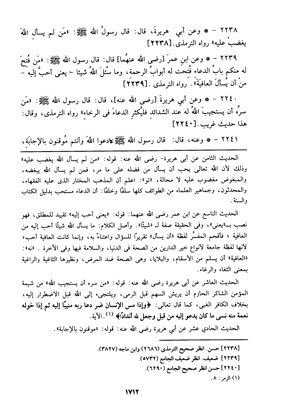 2238 - وعن أبي هريرة قال: قال رسول الله صلى الله عليه وسلم: ((من لم يسأل الله يغضب عليه)) رواه الترمذي. [2238]