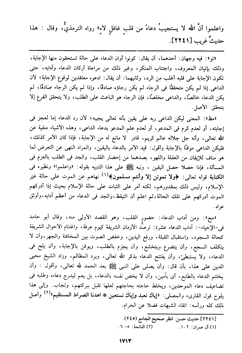 ((مظ)): المعنى ليكن الداعي ربه علي يقين بأنه تعالي يجيبه؛ لأن رد الدعاء إما لعجز في إجابته، أو لعدم كرم في المدعو، أو لعدم علم المدعو بدعاء الداعي، وهذه الأشياء منفية عن الله تعالي، وأنه جل جلاله عالم كريم، قادر لا مانع له من الإجابة، فإذا كان الأمر كذلك، فليكن الداعي موقنًا بالإجابة وأقول: قيد الأمر بالدعاء باليقين، والمراد النهي عن التعرض لما هو مناف للإيقان من الغفلة واللهو، بصدهما من إحضار القلب، والجد في الطلب بالعزم في المسألة، فإذا حصلا حصل اليقين، ونبه صلى الله عليه وسلم هذا التنبيه بقوله: ((واعلموا)) ونظيره في الكناية قوله تعالي: {ولا تموتن إلا وأنتم مسلمون} نهاهم عن الموت علي حالة غير الإسلام، وليس ذلك بمقدورهم، لكنه أمر علي الثبات علي حالة الإسلام بحيث إذا أدركهم الموت أدركهم عل تلك الحالة، ثم اعلم أن التقيظ، والجد في الدعاء من أعظم آدابه، وأوثق عراه.