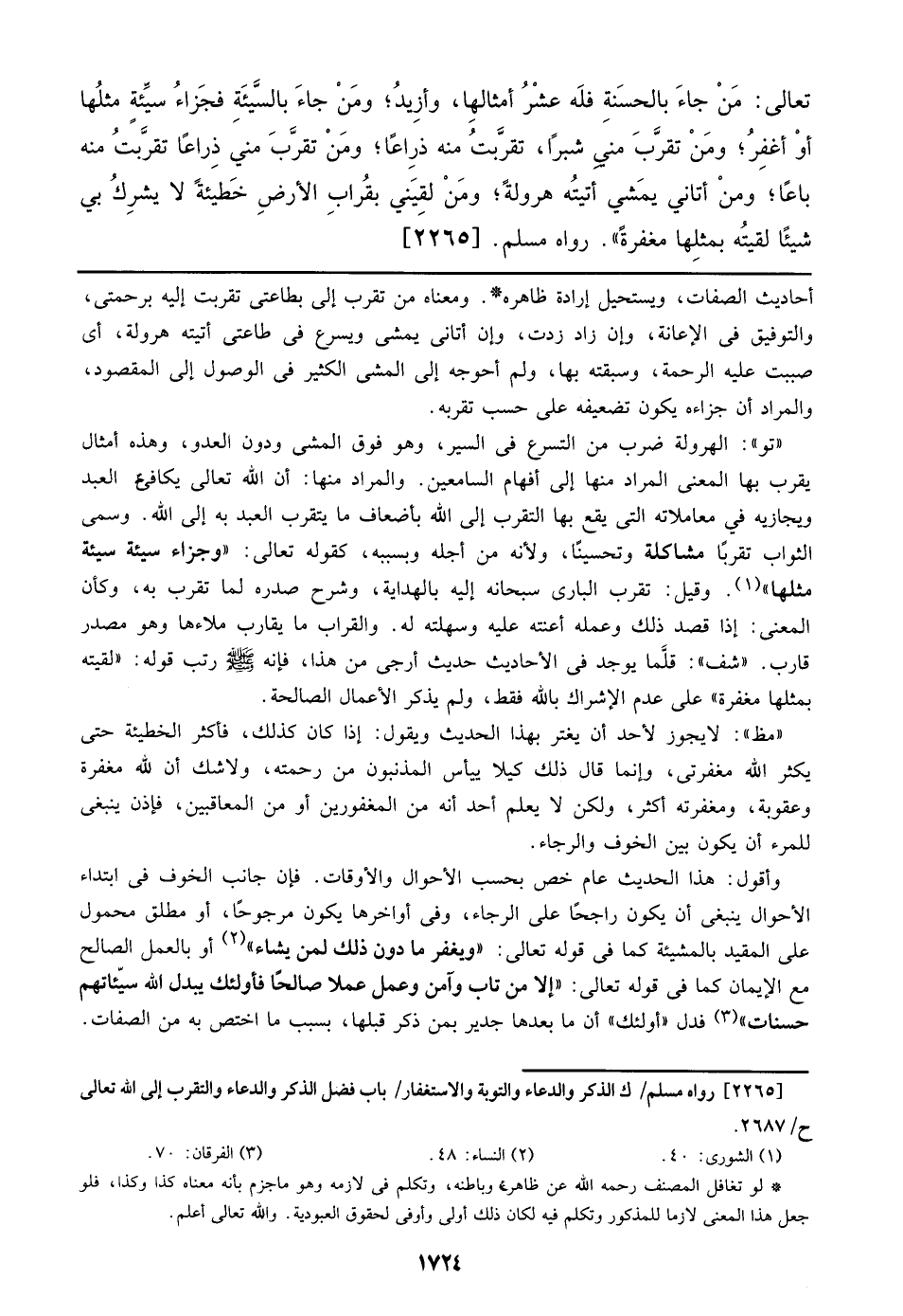 تعالي: من جاء بالحسنة فله عشر أمثالها، وأزيدُ؛ ومن جاء بالسيئة فجزاء سيئة مثلها أو أغفر؛ ومن تقرب مني شبرًا تقربت منه ذراعًا؛ ومن تقرب مني ذراعًا تقربت منه باعًا؛ ومن أتإني يمشي أتيته هرولة؛ ومن لقيني بقراب الأرض خطيئة لا يشرك بي شيئا لقيته بمثلها مغفرة)). رواه مسلم. [2265]