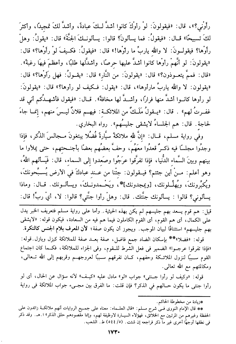 وفي وراية مسلم، قال: ((إن لله ملائكة سيارة فضلا يبتغون مجالس الذكر، فإذا وجدوا مجلسًا فيه ذكر قعدوا معهم، وحف بعضهم بعضا بأجنحتهم، حتى يملئوا ما بينهم وبين السماء الدنيا، فإذا تفرقوا عرجوا وصعدوا إلي السماء، قال: فيسألهم الله، وهو أعلم: من أين جئتم؟ فيقولون: جئنا من عند عبادك في الأرض يسبحونك ويكبرونك، ويهللونك، [ويمجدونك]، ويحمدونك، ويسألونك. قال: وماذا يسألوني؟ قالوا يسألونك جنتك. قال: وهل رأوا جنتي؟ قالوا: لا أي ربِّ! قال: