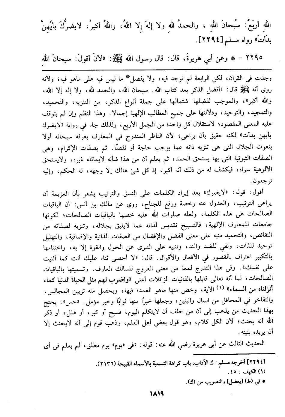 أقول: قوله: ((لا يضرك)) بعد إيراد الكلمات علي النسق والترتيب يشعر بأن العزيمة أن يراعي الترتيب، والعدول عنه رخصة ورفع للجناح، روي عن مالك بن أنس: أن الباقيات الصالحات هي هذه الكلمة، ولعله صلوات الله عليه قد خصها بالباقيات الصالحات؛ لكونها جامعات للمعارف الإلهية، فالتسبيح تقديس لذاته عما لا يليق بجلاله، وتنزيه لصفاته من النقائص، والتحميد منبه علي معنى الفضل والإفضال من الصفات الذاتية والإضافية، والتهليل توحيد للذات، ونفي للضد والند، وتنبيه علي التبري عن الحول والقوة إلا به، واختتامها بالتكبير اعتراف بالقصور في الأفعال والأقوال. قال: ((لا أحصي ثناء عليك أنت كما أثنيت علي نفسك)).وفي هذا التدرج لمعة من معنى العروج للسالك العارف. وتسميتها بالباقيات الصالحات؛ لما أنه تعالي قابلها بالفإنيات الزائلات أعني ((وأضرب لهم مثل الحياة الدنيا كماء أنزلناه من السماء)) الآية، وخص منها ما هو العمدة فيها، ويحصل منه تزيين المجالس، والتفاخر في المحافل من المال والبنين، وجعلها خير منها ثوابا وخير مؤمل. ((حس)):يحتج بهذا الحديث من يذهب إلي أن من حلف أن لا يتكلم اليوم، فسبح أو كبر، أو هلل، أو ذكر الله أنه يحنث؛ لأن الكل كلام، وهو قول بعض أهل العلم، وذهب قوم إلا أنه لا يحنث إلا أن يريده بنيته.