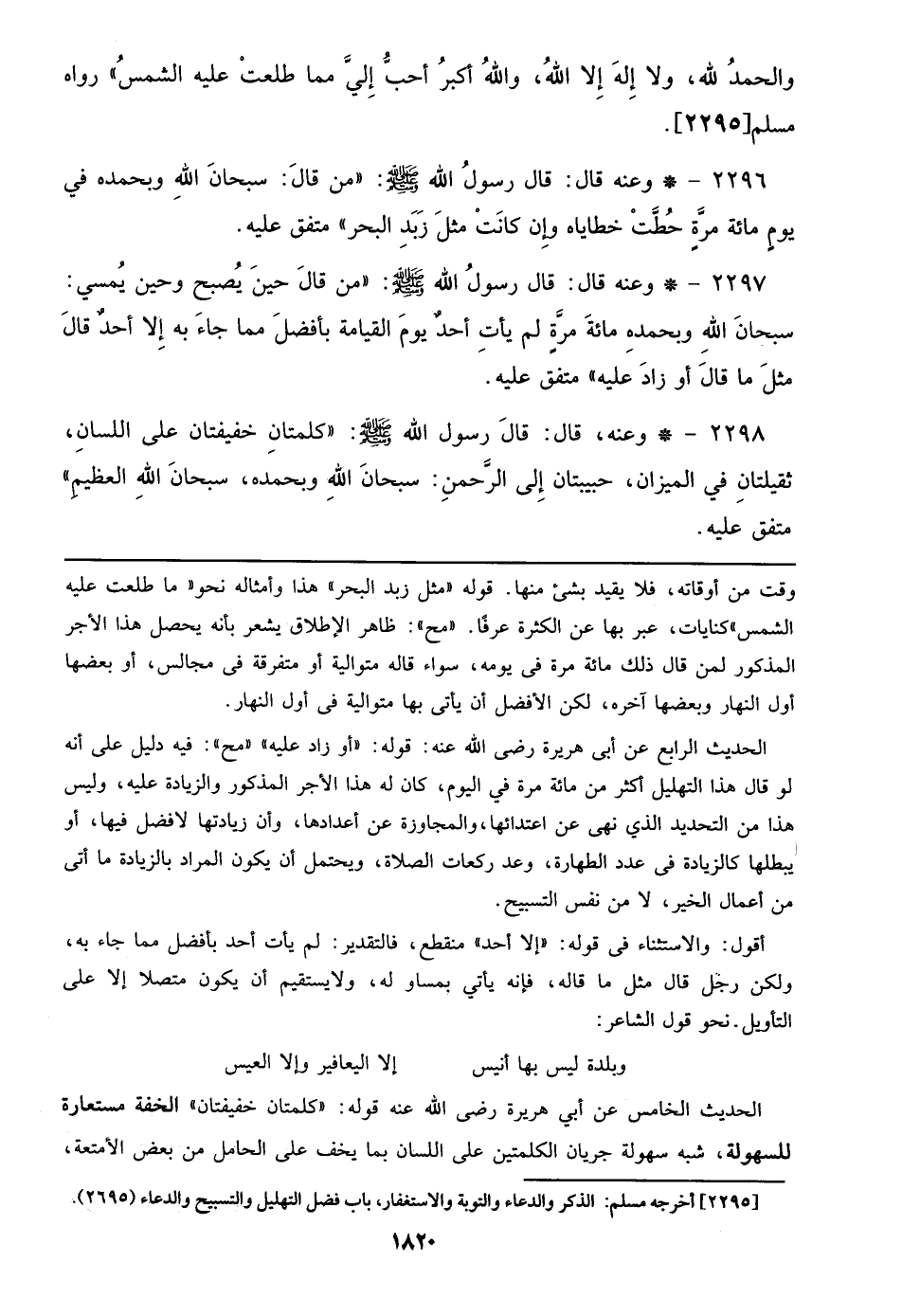 2297 - وعنه قال: قال رسول الله صلى الله عليه وسلم: ((من قال حين يصبح وحين يمسي: سبحان الله وبحمده مائة مرة لم يأت أحد يوم القيامة بأفضل مما جاء به إلا أحد قال مثل ما قال أو زاد عليه)) متفق عليه.