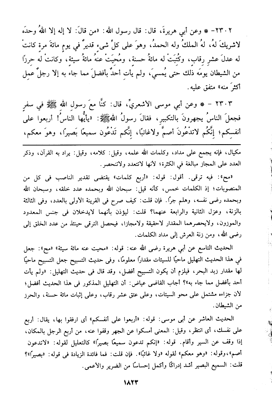 الحديث العاشر عن أبي موسى: قوله: ((أربعوا علي أنفسكم)) أي ارفقوا بها، يقال: أربع علي نفسك، أي انتظر، وقيل: المعنى أمسكوا عن الجهر وقفوا عنه،، من أربع الرجل بالمكان، إذا وقف عن السير وأقام. قوله: ((إنكم تدعون سميعا بصيرا)) كالتعليل لقوله: ((لا تدعون أصم))،وقوله: ((وهو معكم)) لقوله ((ولا غائبا)).فإن قلت: فما فائدة الزيادة في قوله: ((بصيرا))؟ قلت: السميع البصير أشد إدراكا وأكمل إحساسا من الضرير والأعمى.