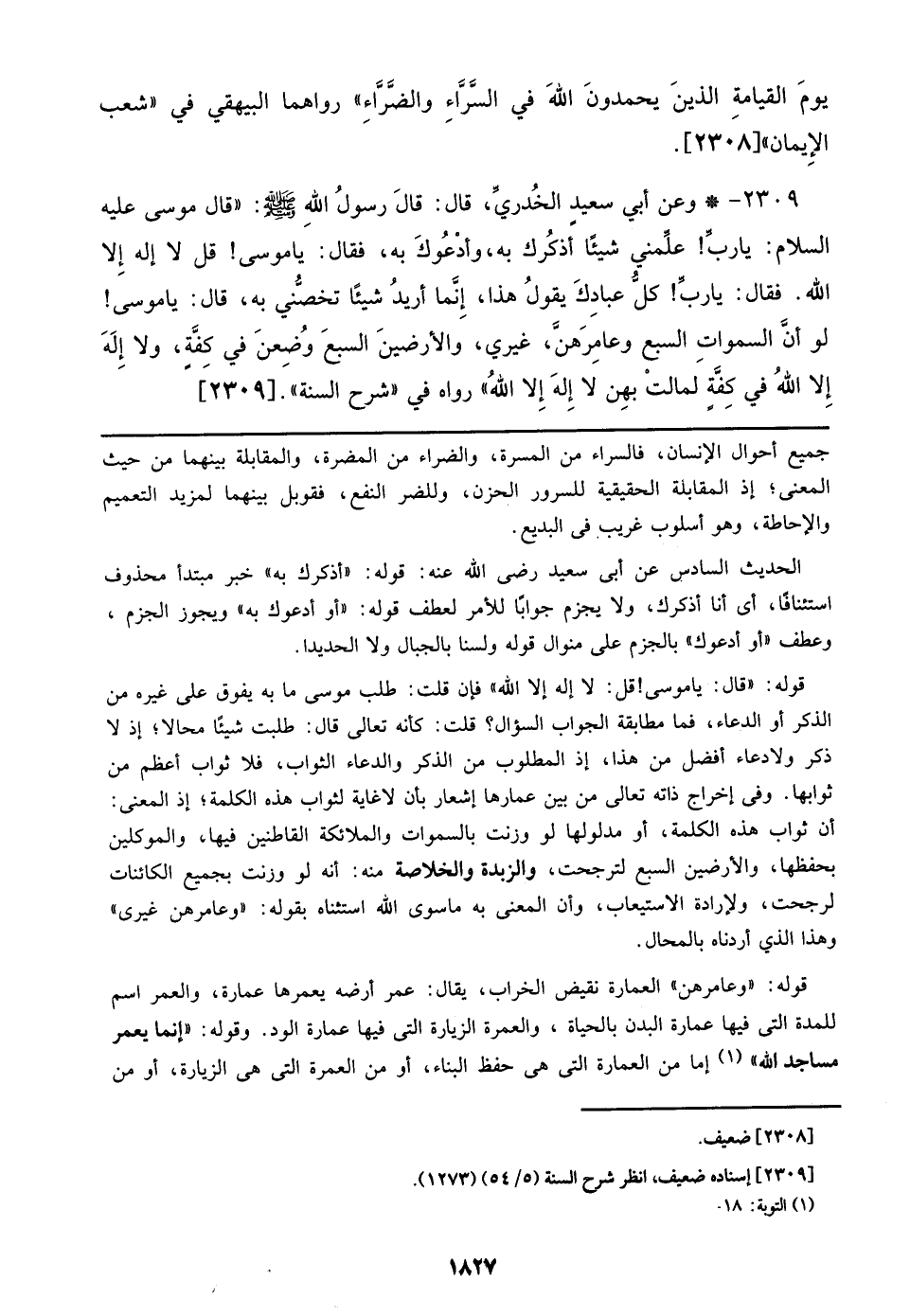 2309 - وعن أبس سعيد الخدري، قال: قال رسول الله صلى الله عليه وسلم: ((قال موسى عليه السلام: يارب! علمني شيئا أذكرك به، وأدعوك به، فقال: يا موسى! لو أن السموات السبع وعامرهن، غيري، والأرضين السبع وضعن في كفة، ولا إله إلا الله في كفة لمالت بهن لا إله إلا الله)) رواه في ((شرح السنة)). [2309]