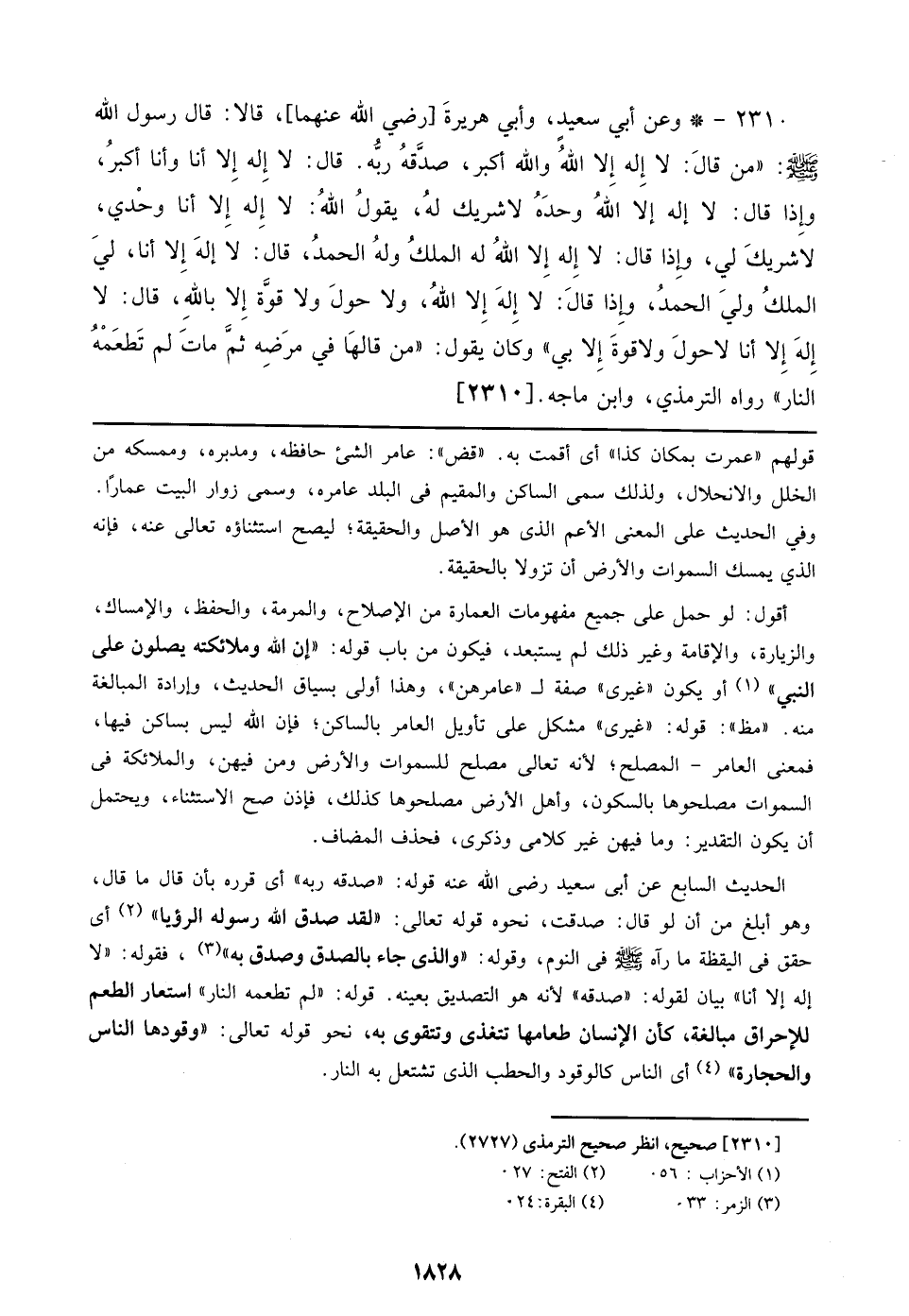 2310 - وعن أبي سعيد، وأبي هريرة ((رضي الله عنهما))، قالا: قال رسول الله صلى الله عليه وسلم: ((من قال: لا إله إلا الله والله أكبر، صدقه ربه. قال: لا إله إلا أنا وأنا أكبر، وإذا قال: لا إله إلا الله وحده لا شريك له، يقول الله: لا إله إلا أنا وحدي، لا شريك لي، وإذا قال: لا إله إلا الله له الملك وله الحمد، قال: لا إله إلا أنا، لي الملك ولي الحمد، وإذا قال: لا إله إلا الله، ولا حول ولا قوة إلا بالله، قال: لا إله إلا أنا لا حول ولا قوة إلا بي)) وكان يقول: ((من قالها في مرضه ثم مات لم تطعمه النار)) رواه الترمذي، وابن ماجه. [2310]