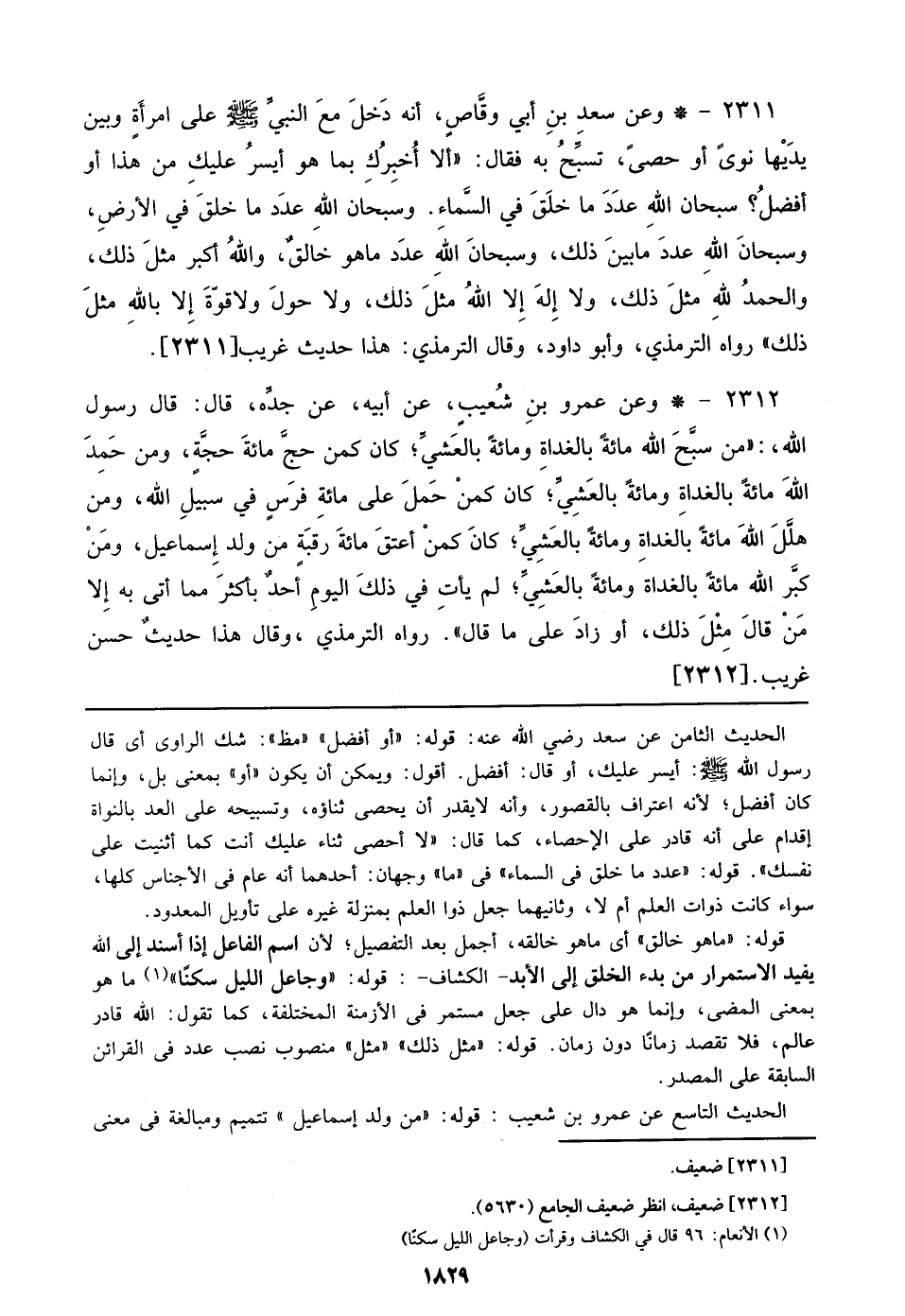 2311 - وعن سعد بن أبي وقاص، أنه دخل مع النبي صلى الله عليه وسلم علي امرأة وبين يديها نوى أو حصى، تسبح به فقال: ((ألا أخبرك بما هو أيسر عليك من هذا أو أفضل؟ سبحان الله عدد ما خلق في السماء. وسبحان الله عدد ما خلق في الأرض، وسبحان الله عدد مابين ذلك، وسبحان الله عدد ما هو خالق، والله أكبر مثل ذلك، والحمدلله مثل ذلك، ولا إله إلا الله مثل ذلك، ولا حول ولا قوة إلا بالله مثل ذلك)) رواه الترمذي، وأبو داود, وقال الترمذي: هذا حديث غريب. [2311]